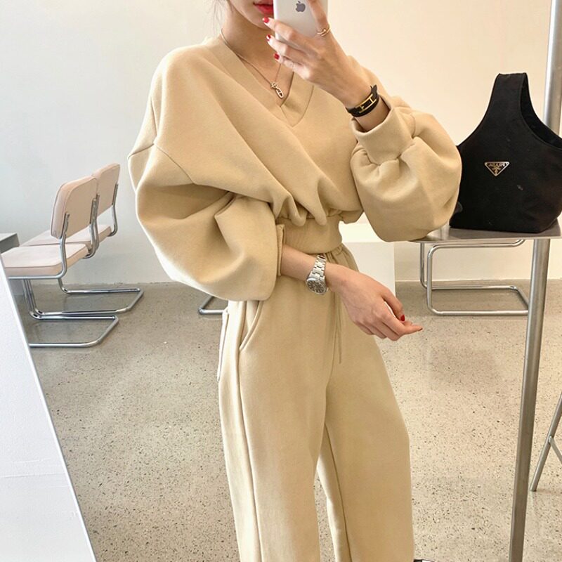 Утепленная короткая толстовка, штаны, осенний демисезонный модный комплект, лонгслив, V-образный вырез, свободный крой, популярно в интернете