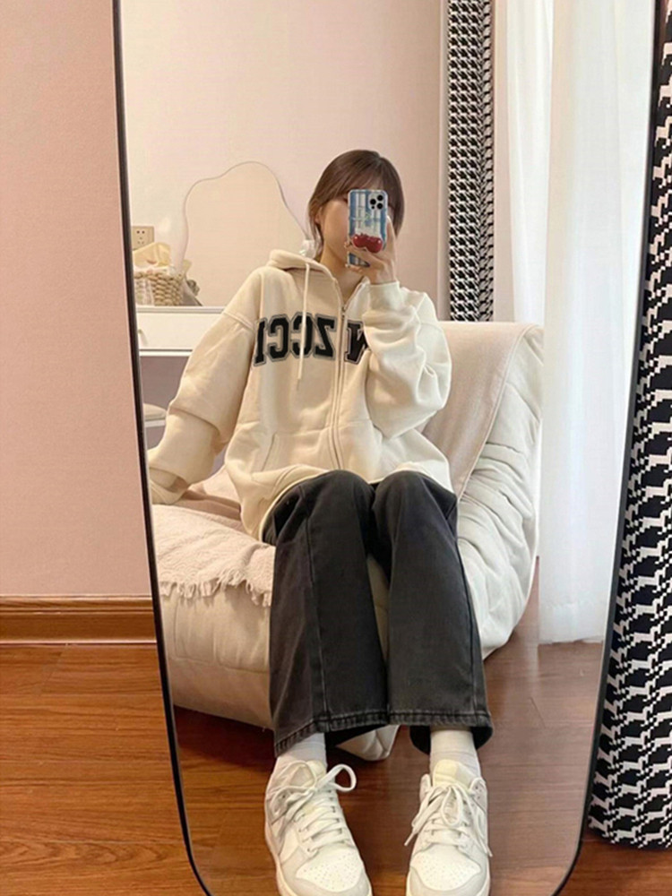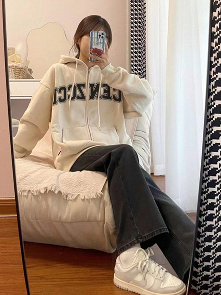 Ретро белая весенняя толстовка с капюшоном, куртка с молнией, в американском стиле, оверсайз, коллекция 2023, подходит для подростков