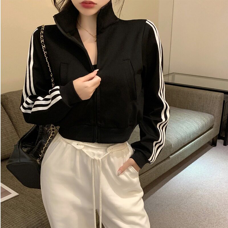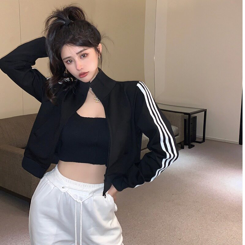 Черная осенняя короткая толстовка с молнией, тонкая куртка, городской стиль, высокая талия