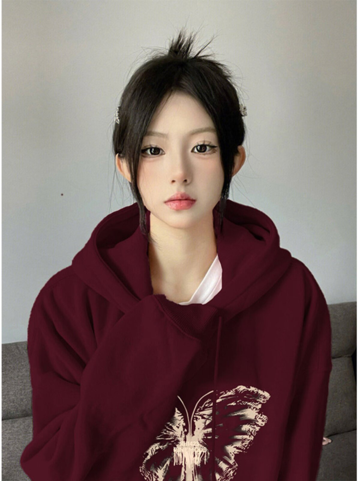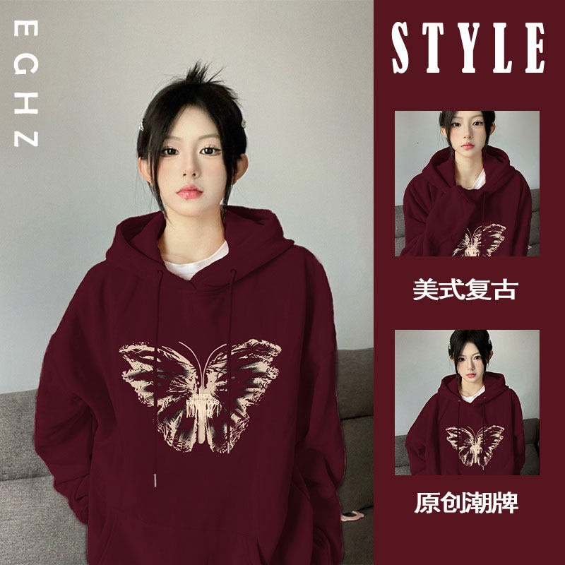 Бордовая ретро осенняя утепленная толстовка с капюшоном, лонгслив, в американском стиле, оверсайз