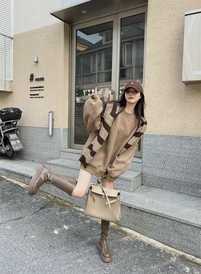 Ретро весенний лонгслив с круглым воротником, тонкие коричневые джинсы с начесом, куртка, в американском стиле