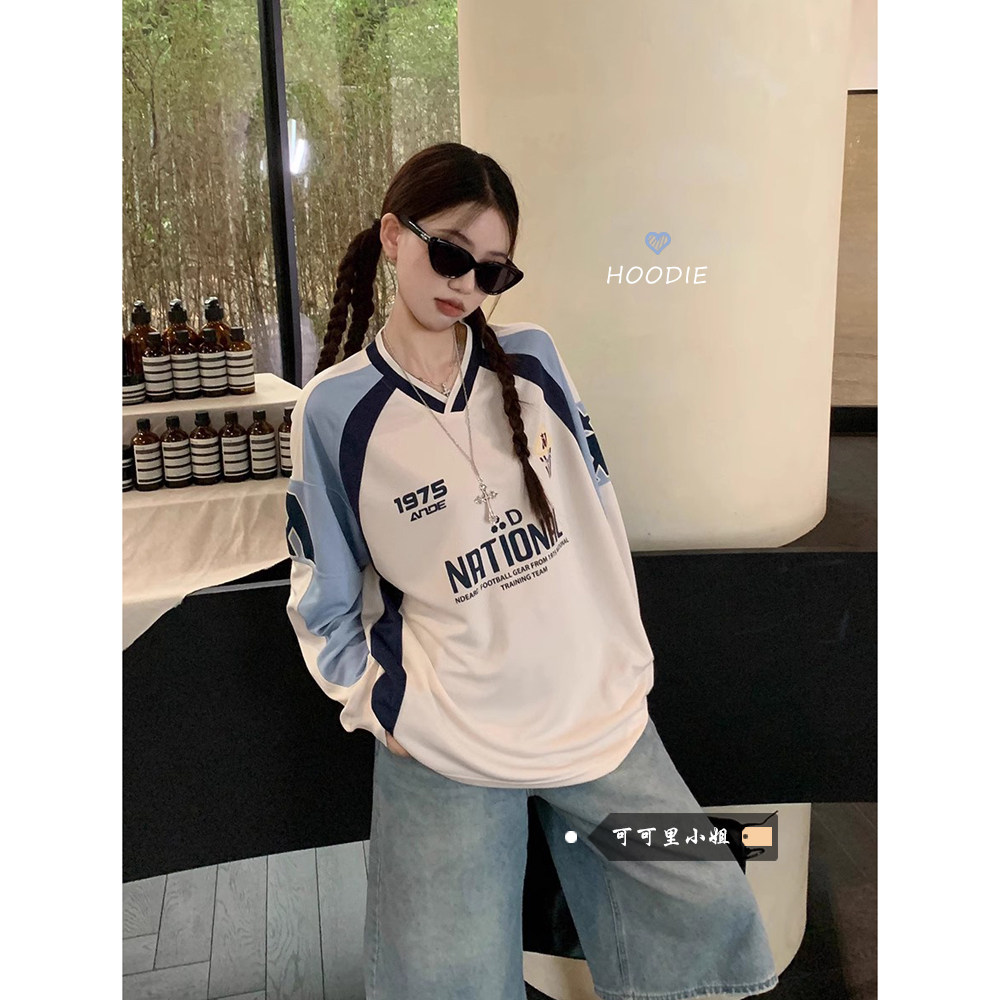 Осенний дизайнерский длинный лонгслив, в американском стиле, V-образный вырез, тренд сезона, средней длины