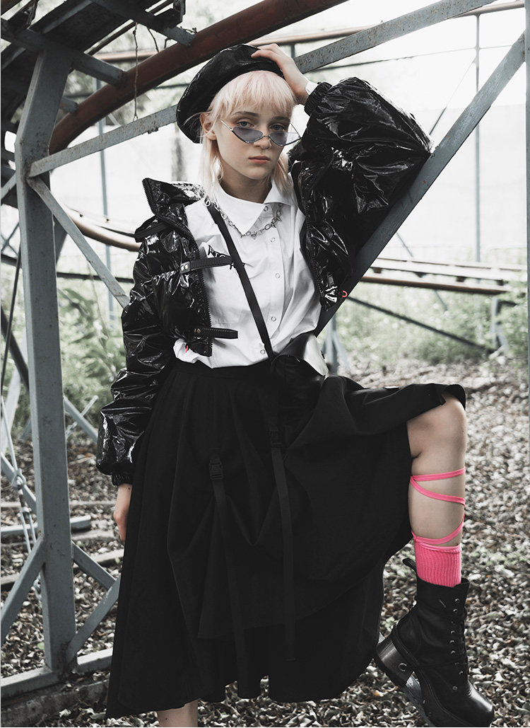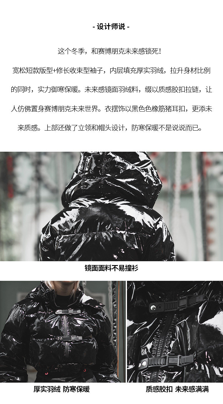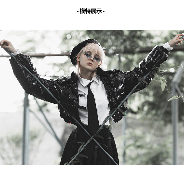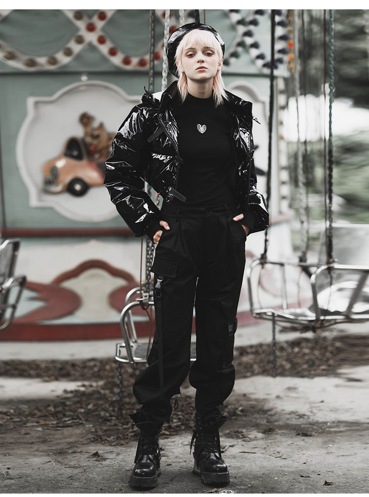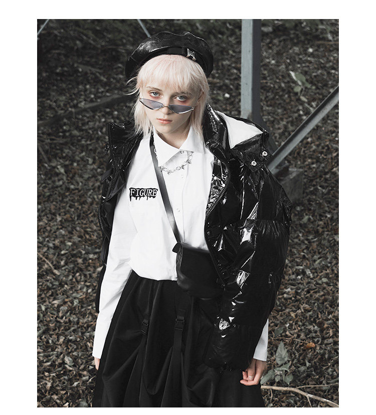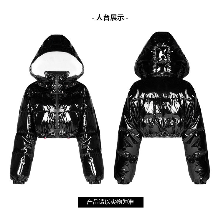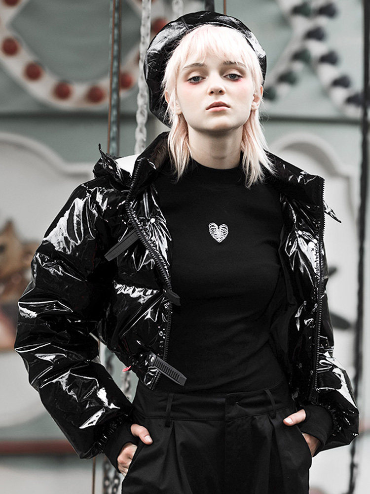 Черный глянцевый короткий пуховик, модная куртка, в стиле панк, свободный крой