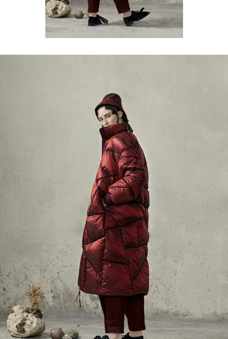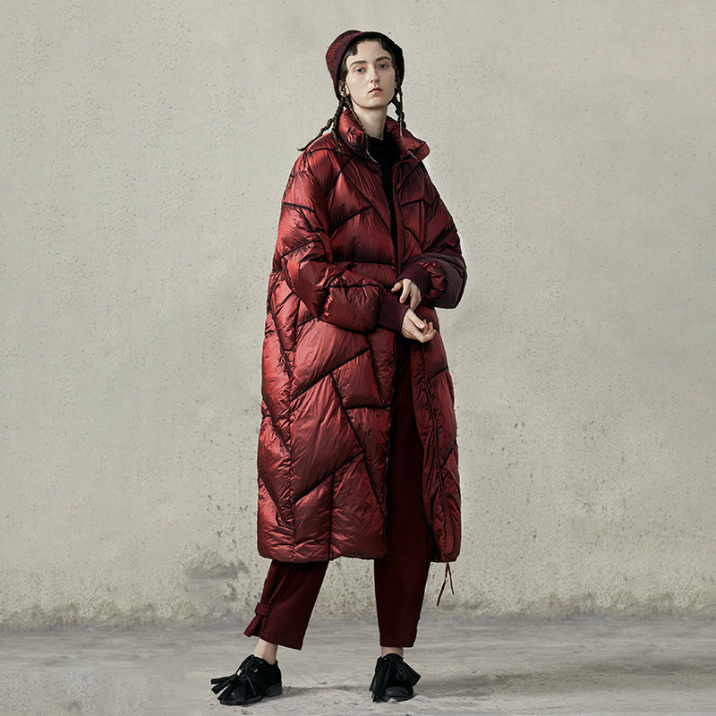 半圆 Оригинальный дизайнерский зимний красный глянцевый бархатный пуховик, коллекция 2022, утиный пух, длина миди