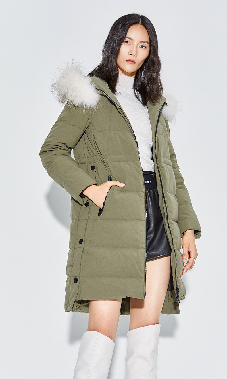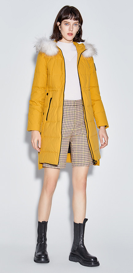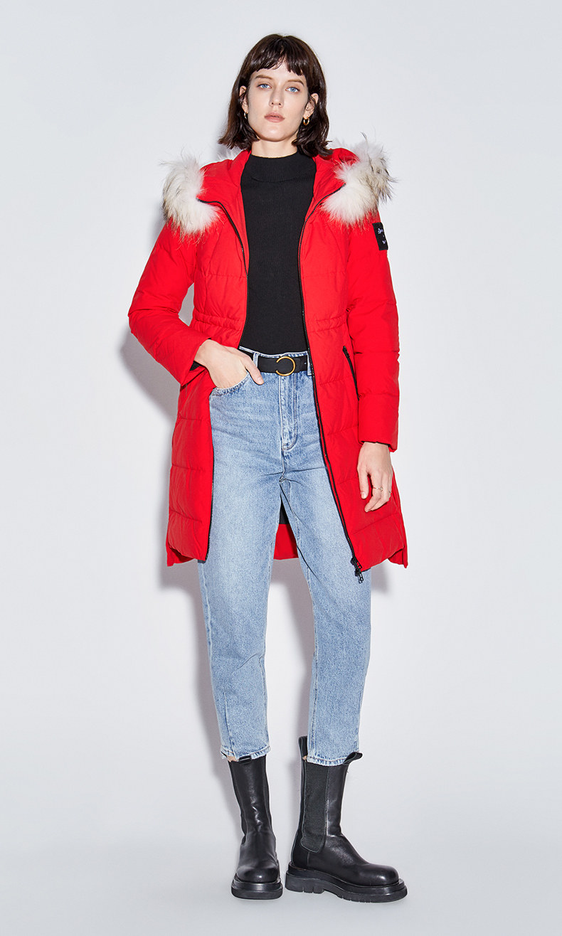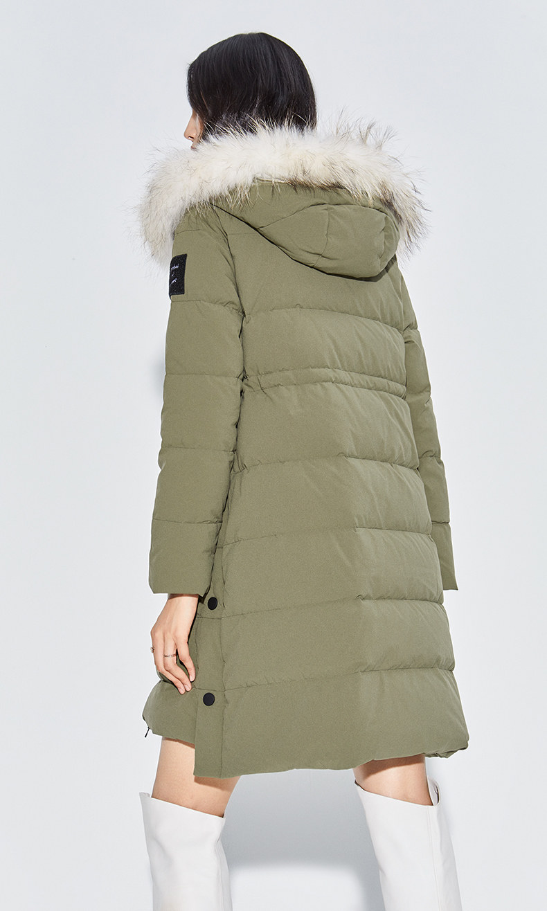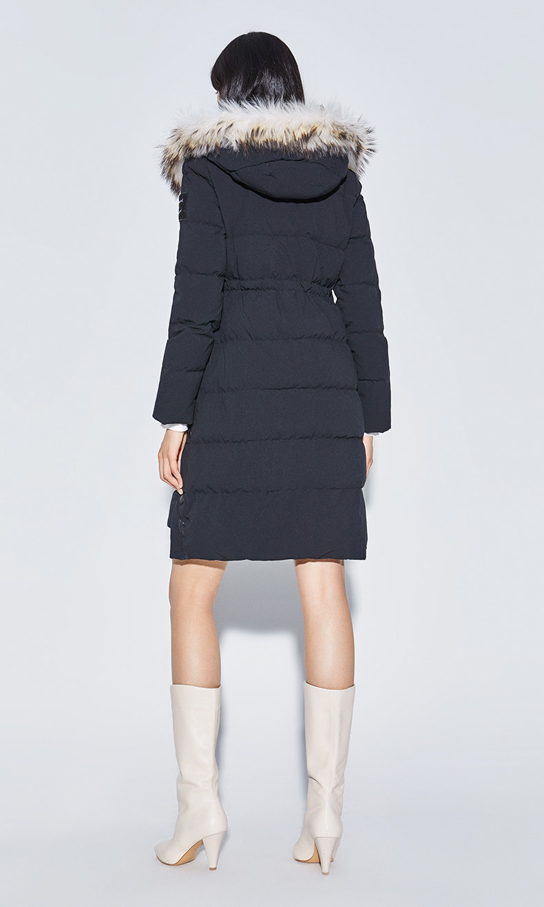 Наполнитель с высоким содержанием серого утиного пуха, технология бамбукового стегания добавлены для уменьшения объема, а аппликации обогащают детали стиля. Пуховая вещь теплая, но модная.