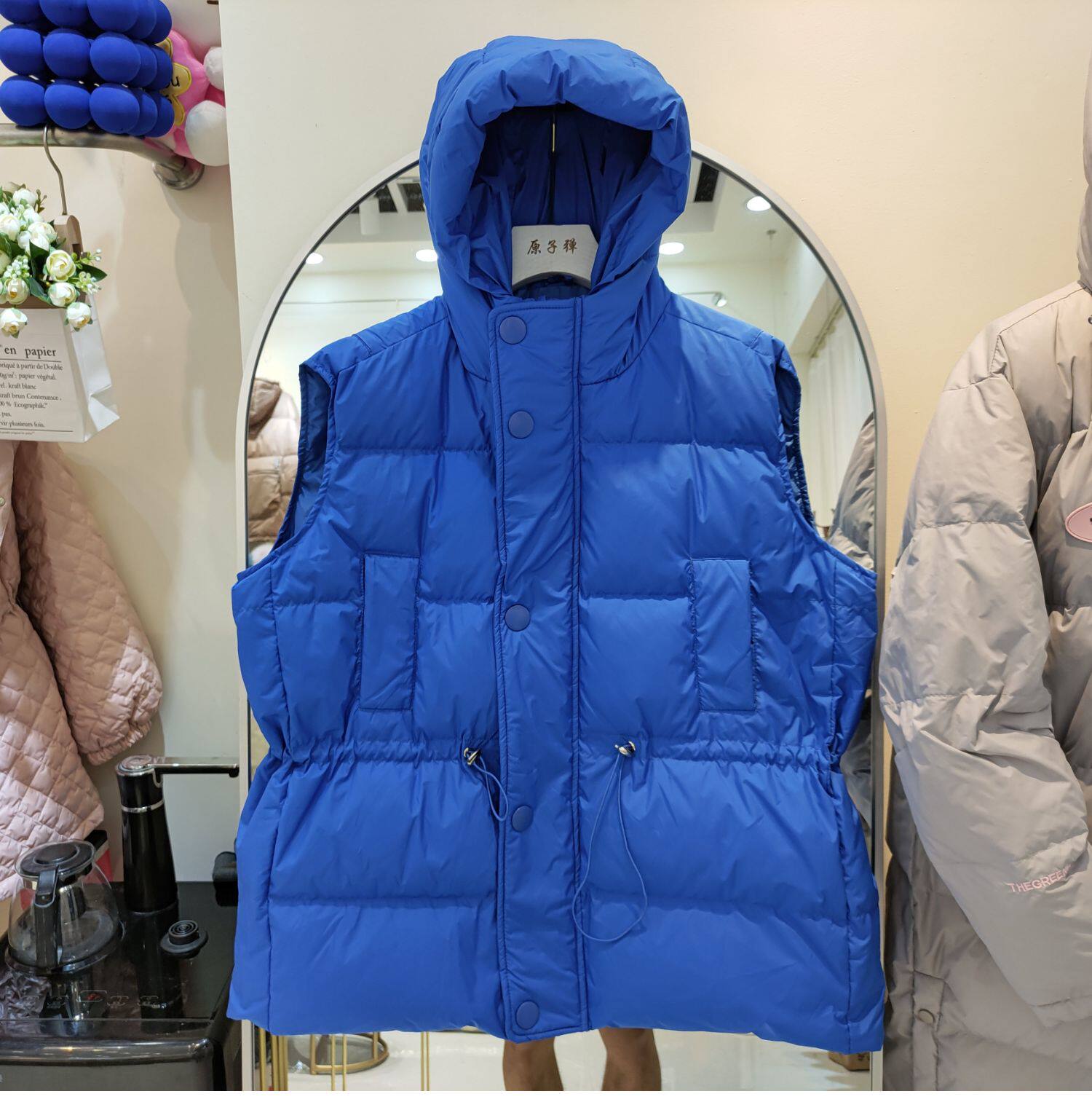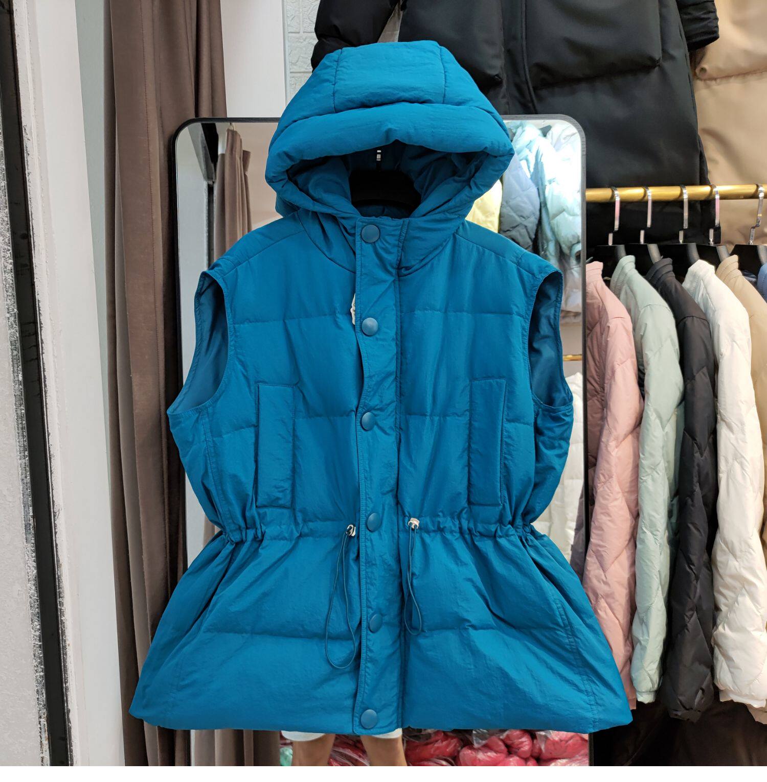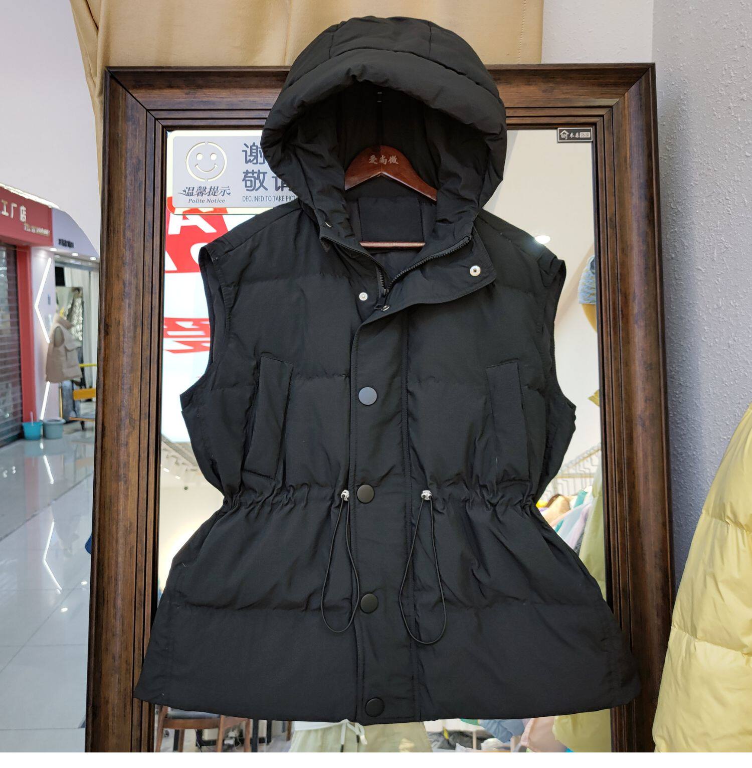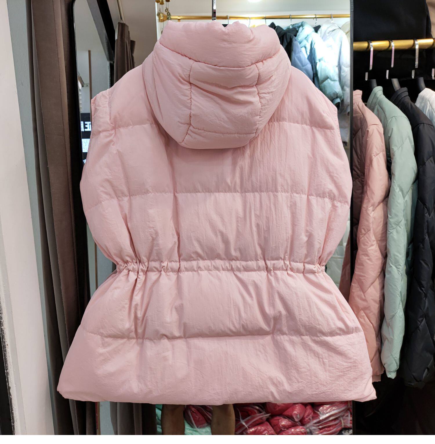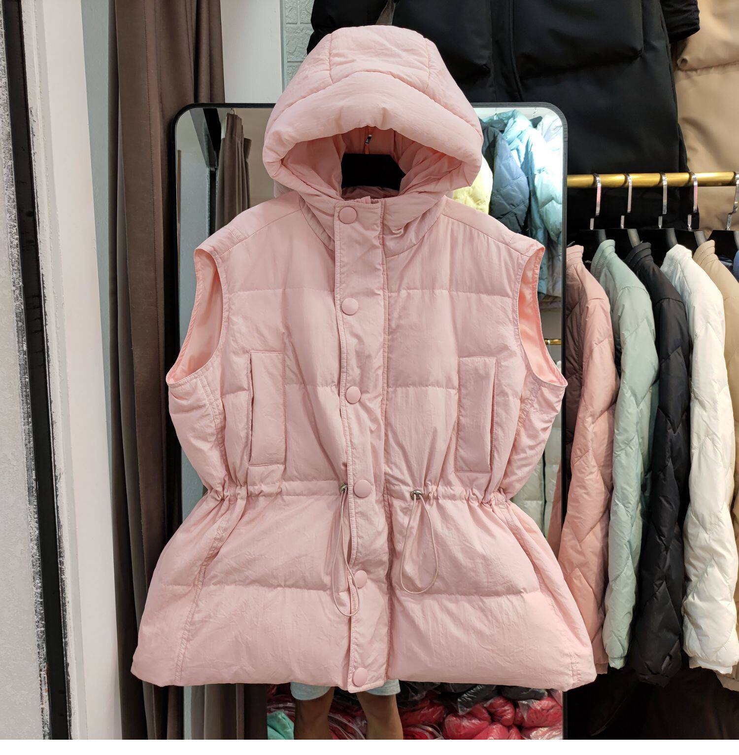 Пуховик, короткий жилет с капюшоном, приталенный бархатный корсет, коллекция 2021, на шнурках, утиный пух