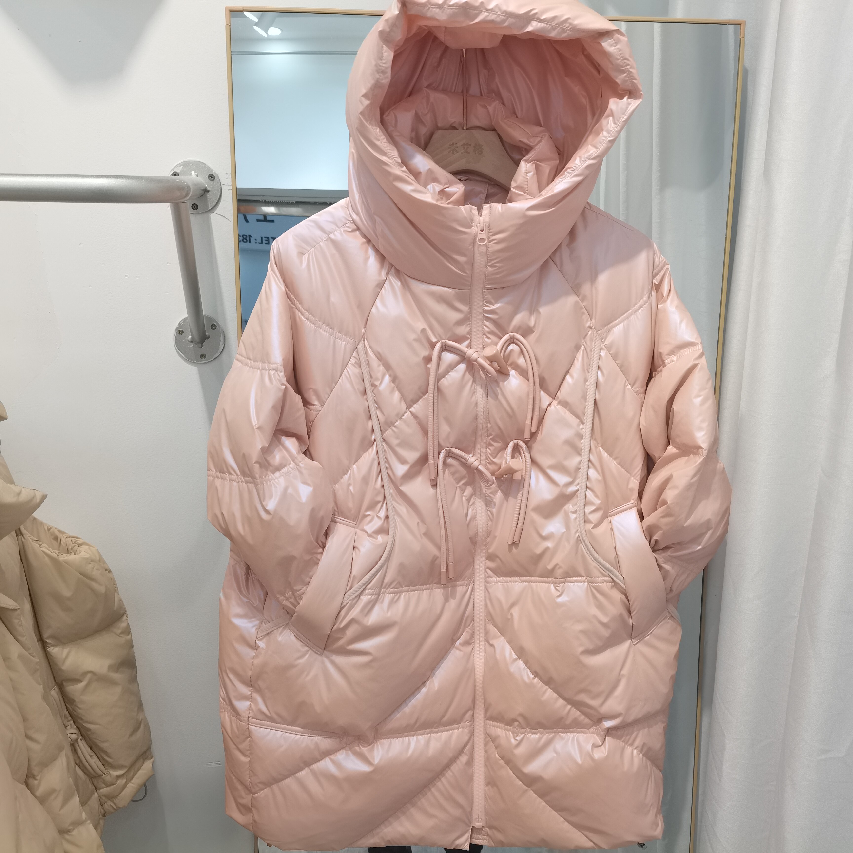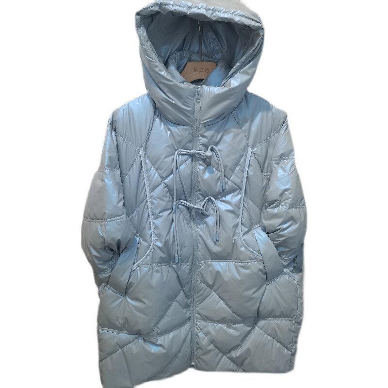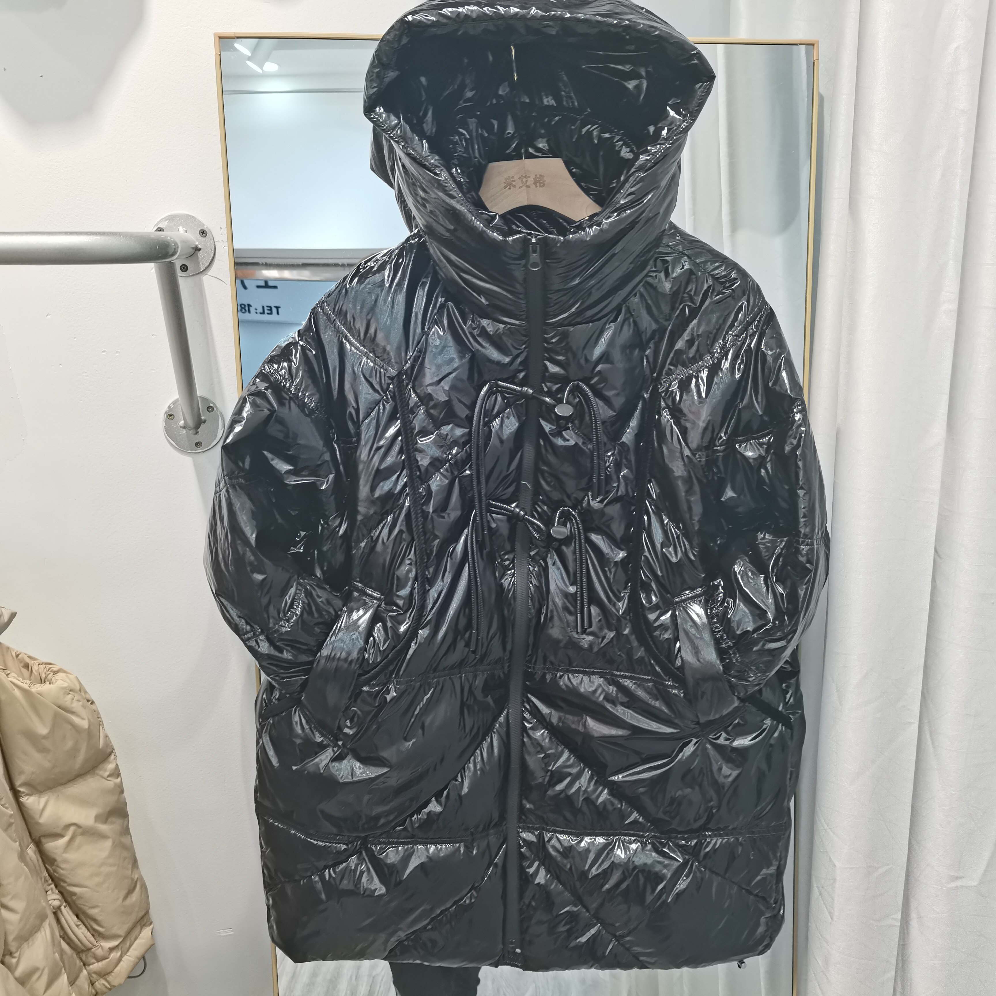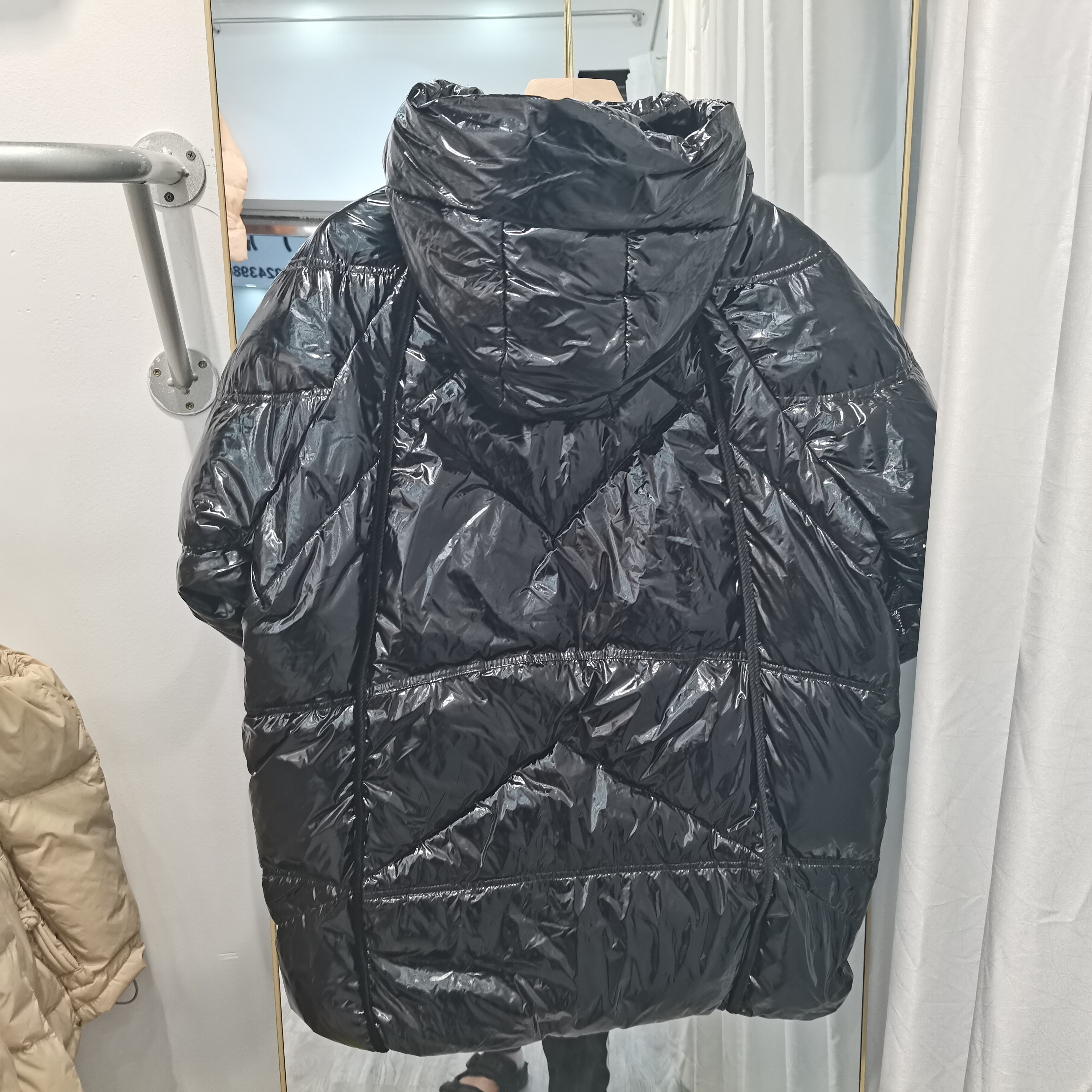 Глянцевый пуховик с капюшоном, демисезонная куртка, тренд сезона, длина миди, на шнурках, большой размер