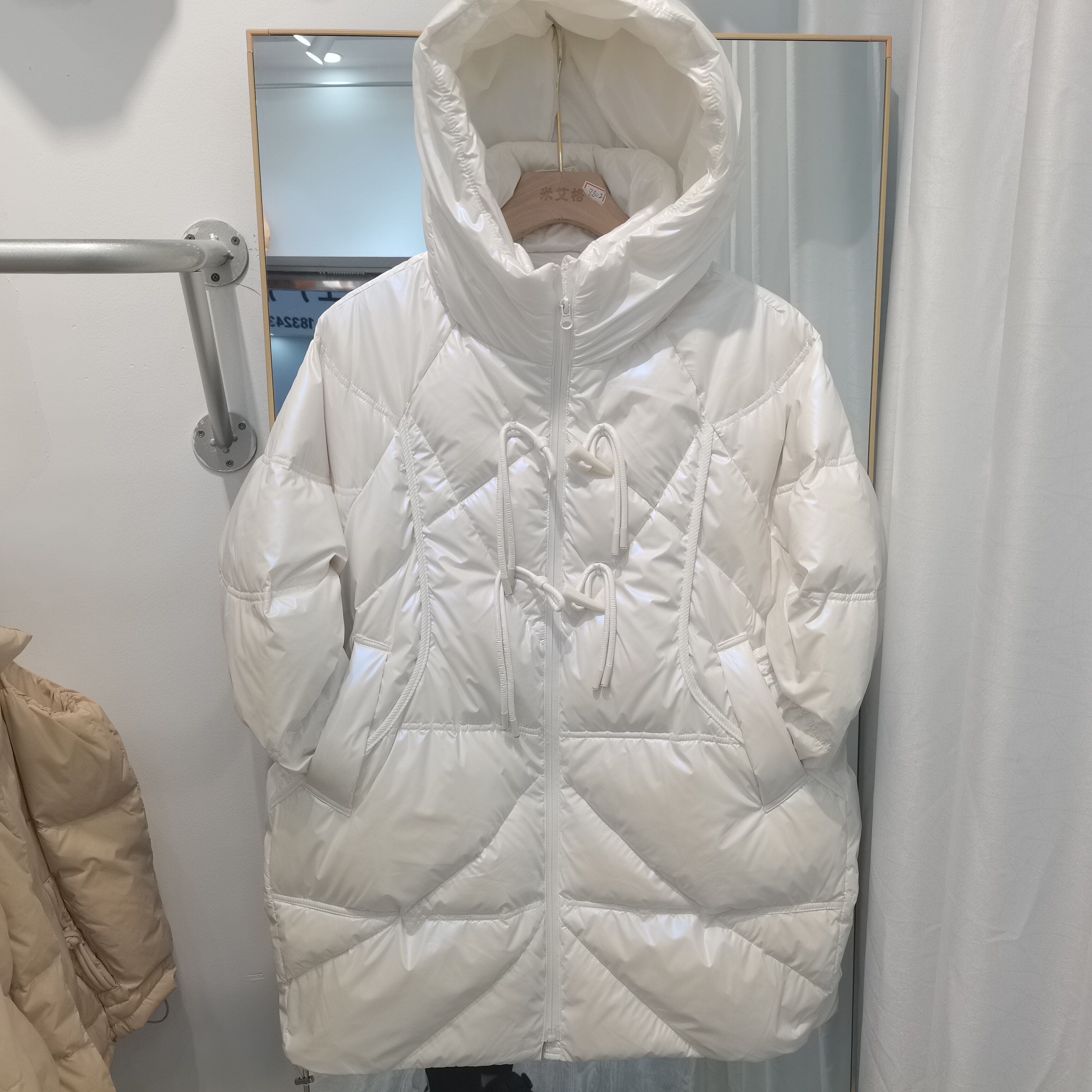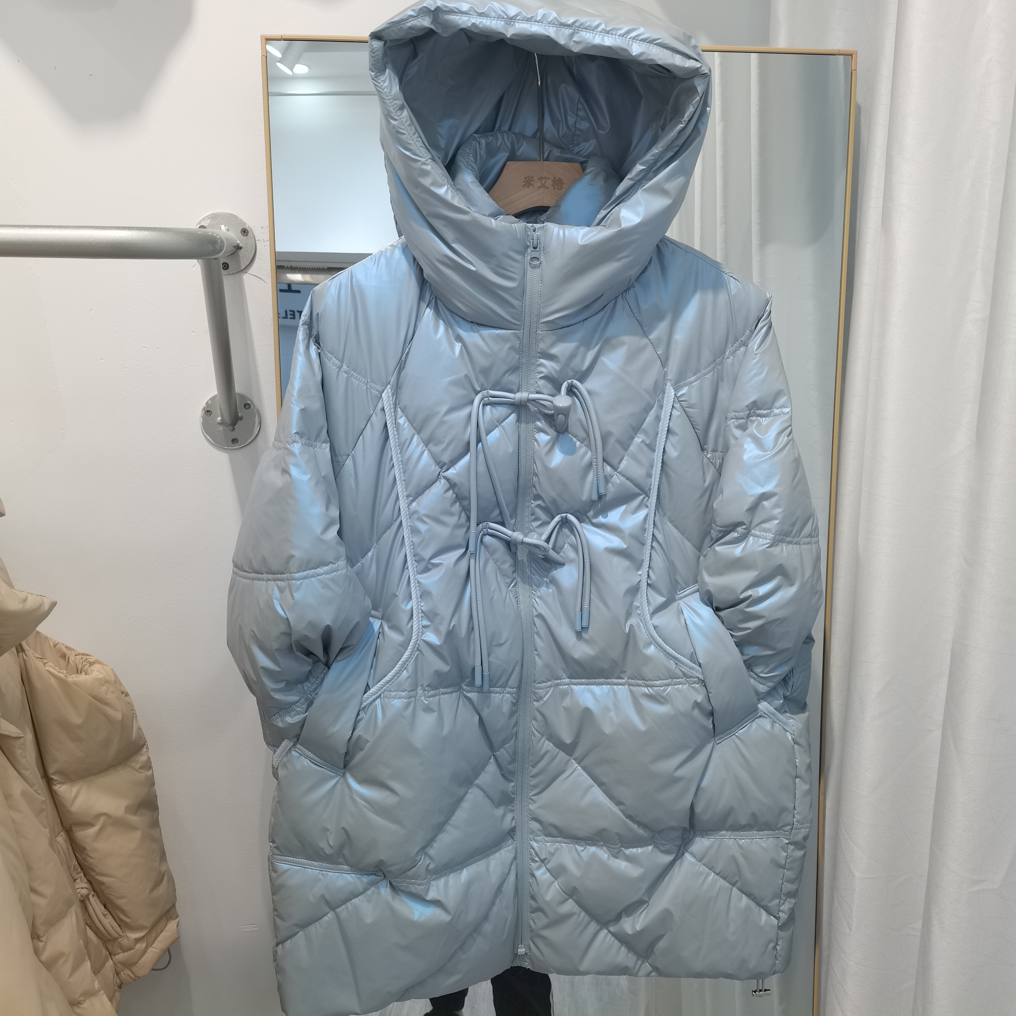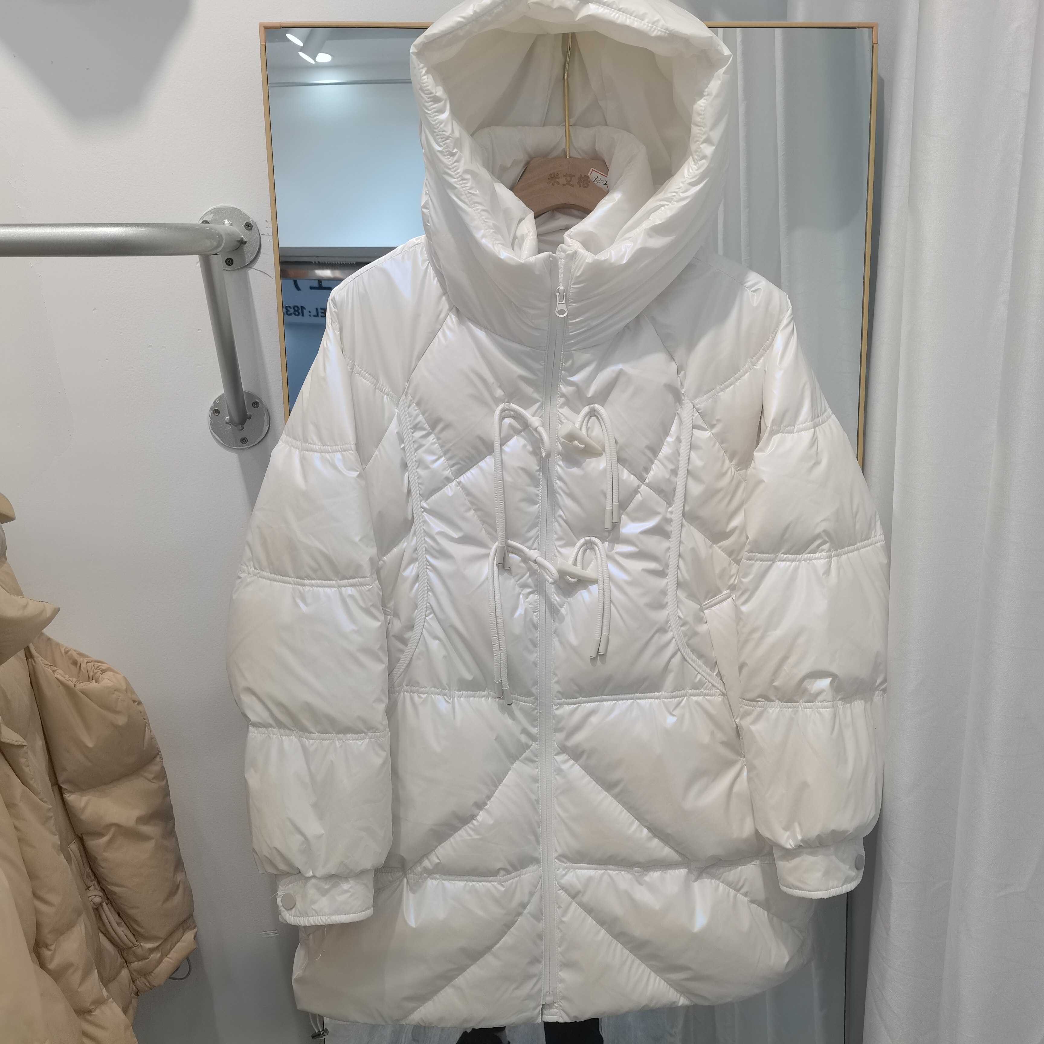 Глянцевый пуховик с капюшоном, демисезонная куртка, тренд сезона, длина миди, на шнурках, большой размер