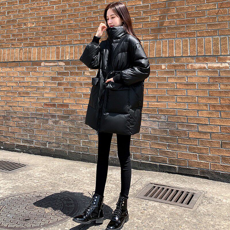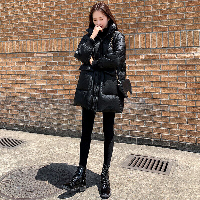 Черный глянцевый зимний пуховик, длинный корсет, бархатная куртка, 2023, в корейском стиле, средней длины, утиный пух