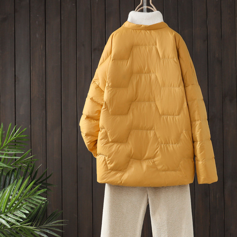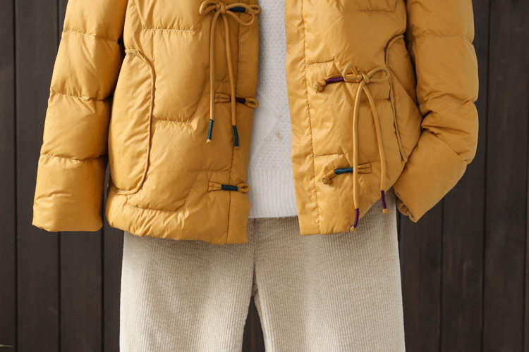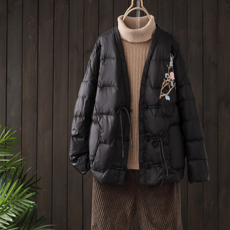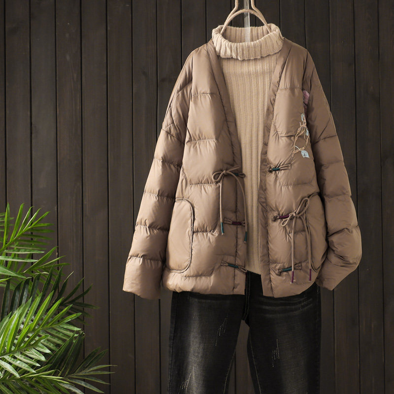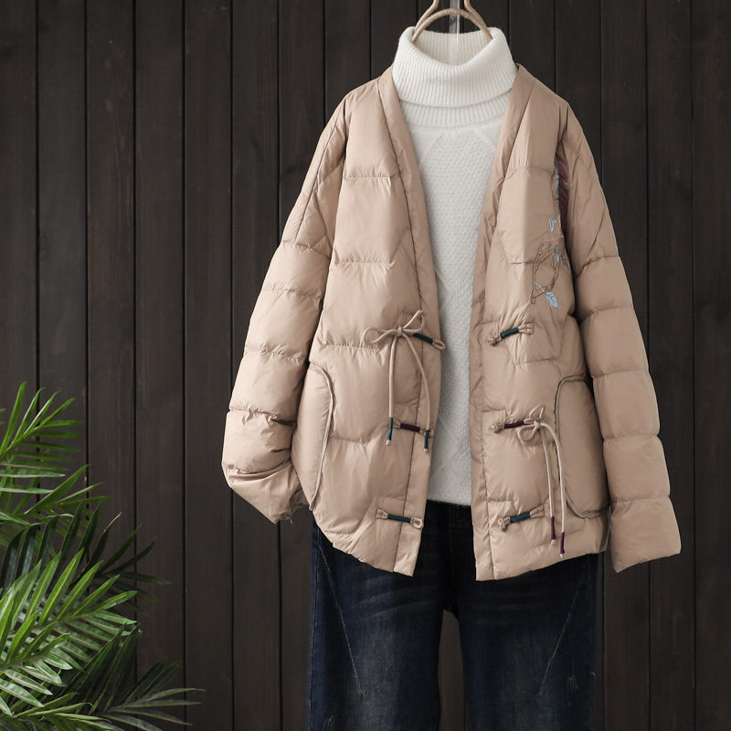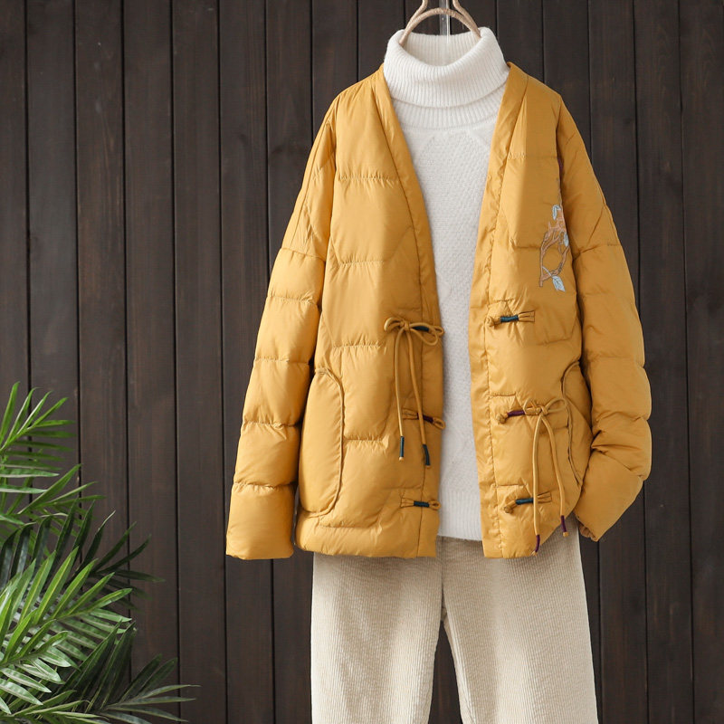 Зимний бархатный легкий и тонкий этнический пуховик, короткая куртка, 2022, утиный пух, этнический стиль, с вышивкой, V-образный вырез, оверсайз