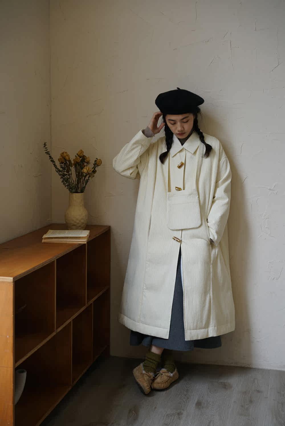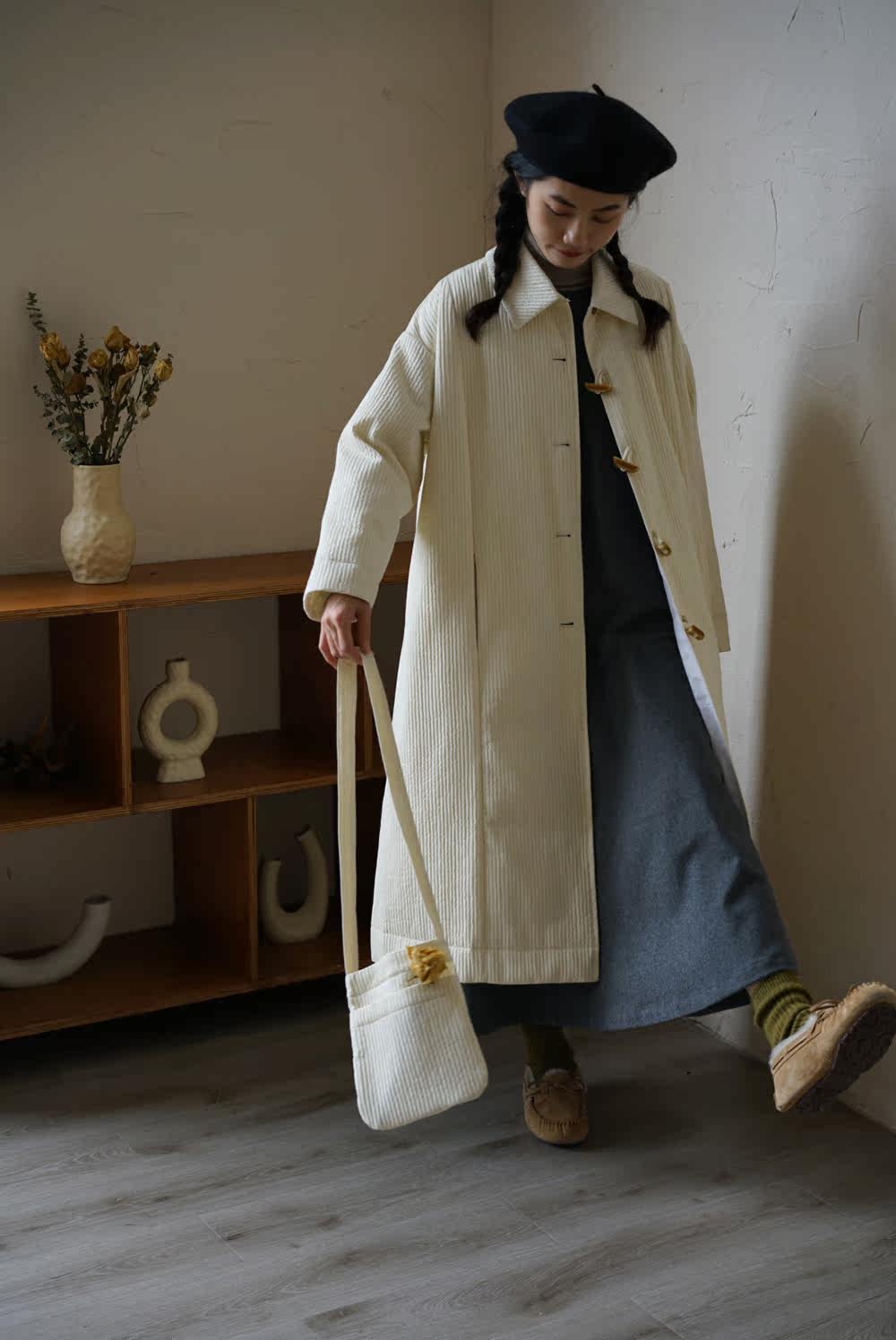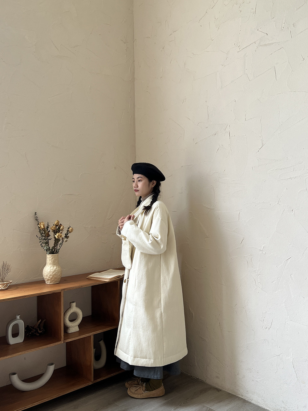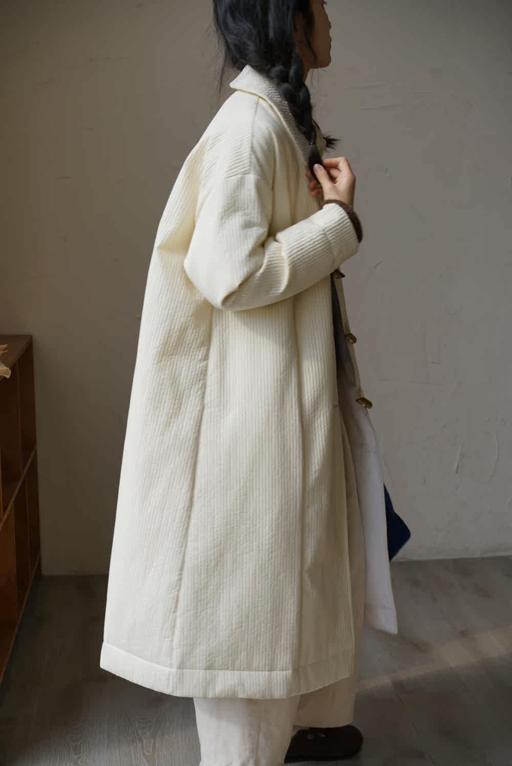 Зимний сливочный пуховик, средней длины