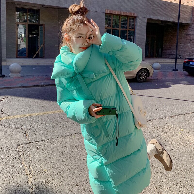 Японский дизайнерский длинный удерживающий тепло пуховик для отдыха с бантиком, длина макси, свободный крой