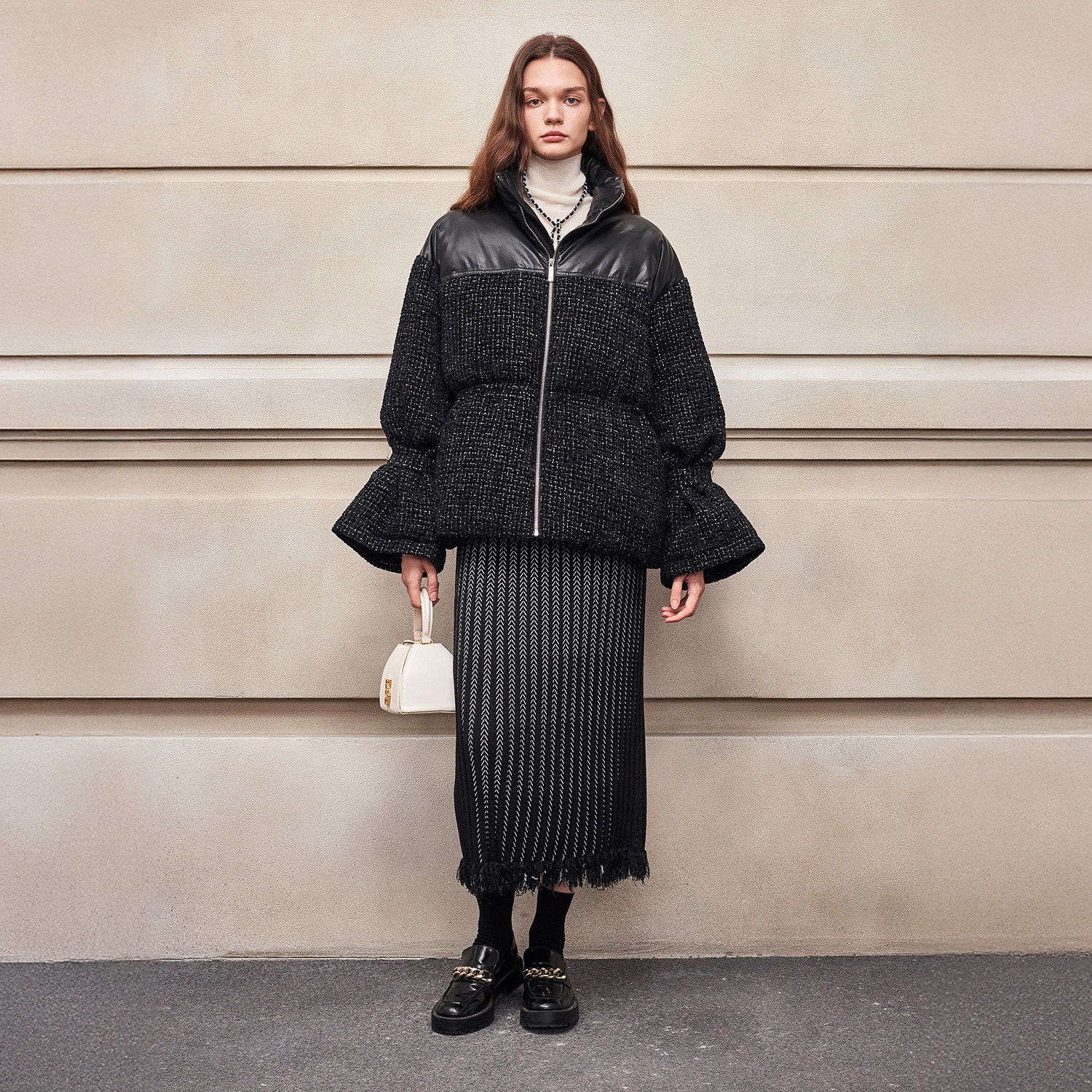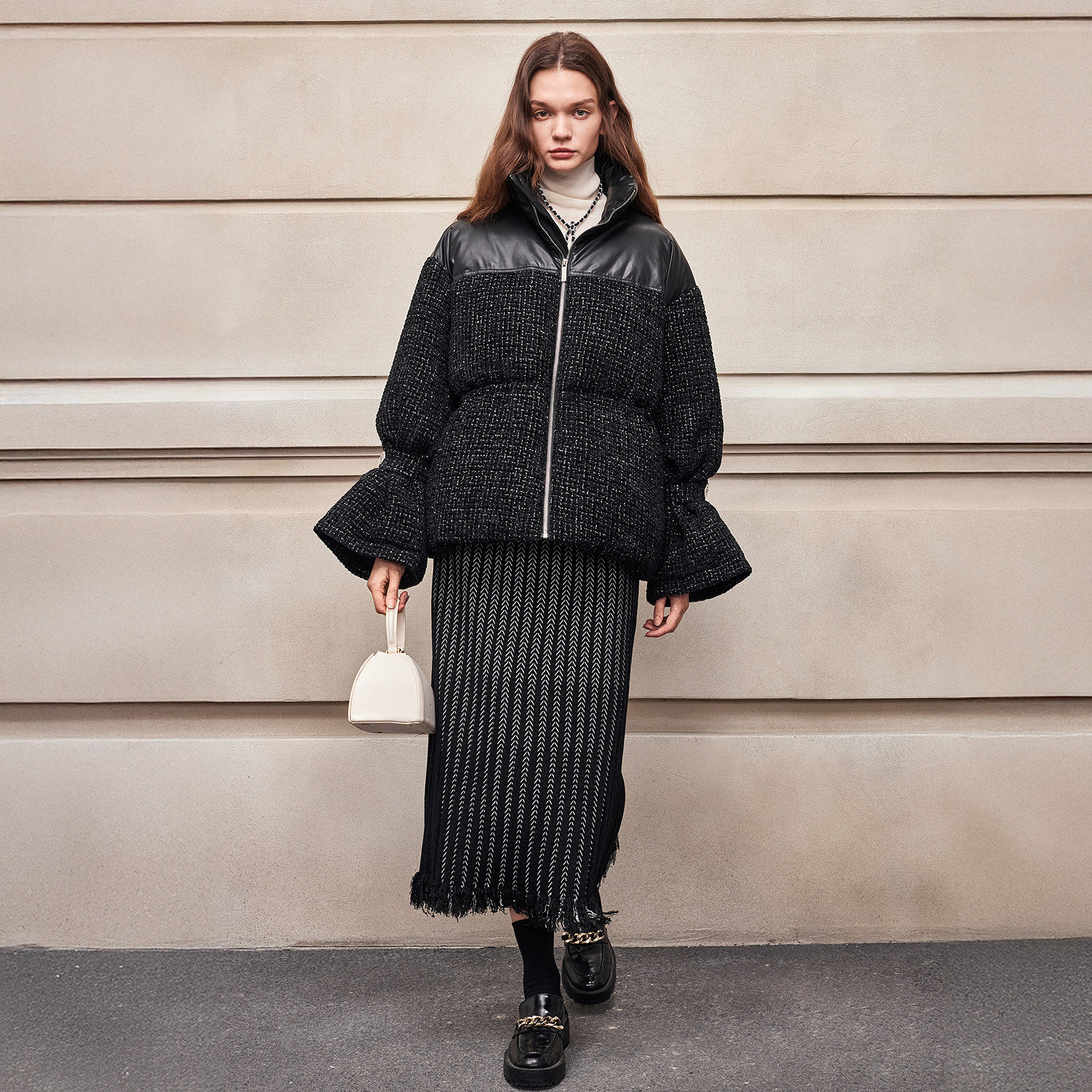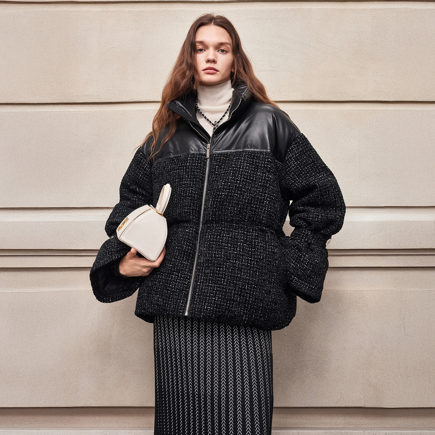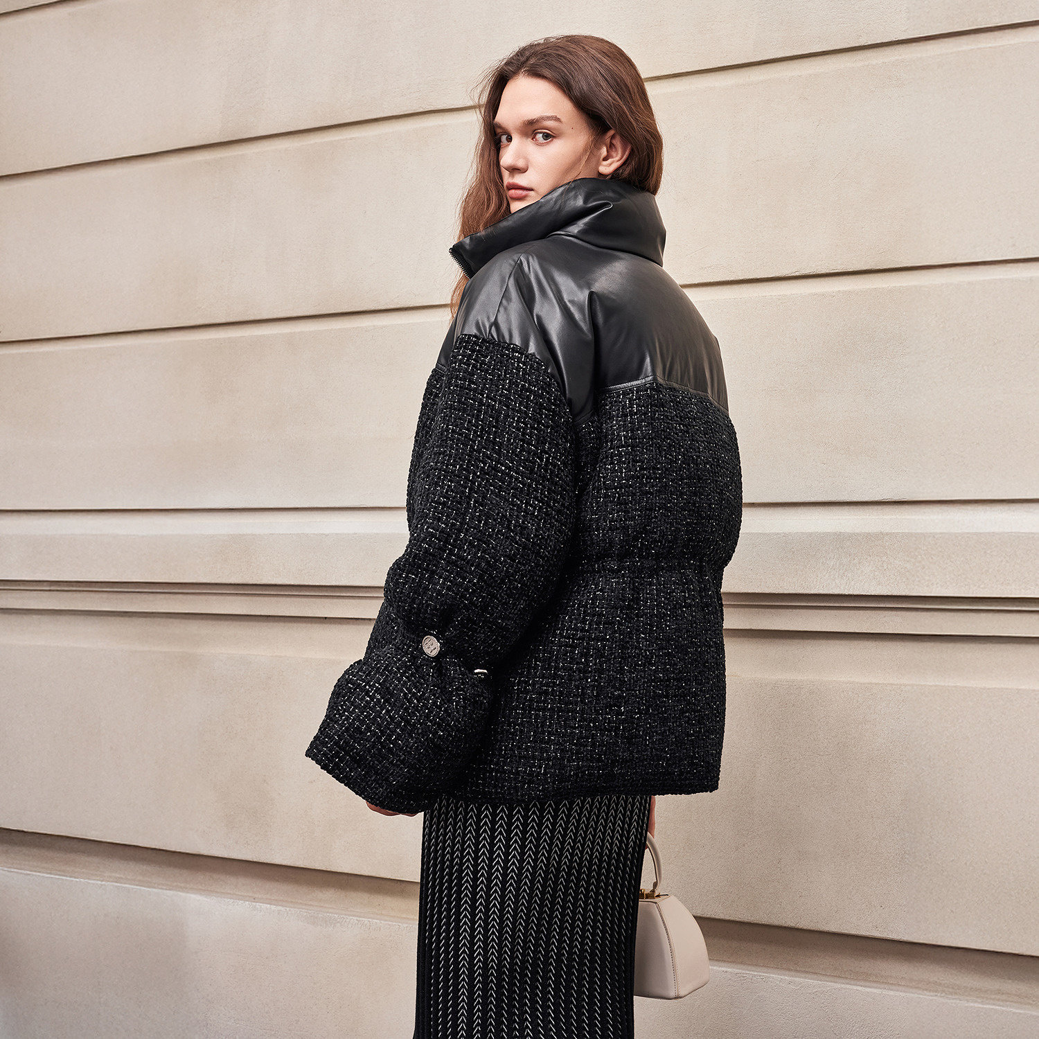 [90 Гусиный пух] BCBG Женский универсальный твидовый пуховик для поездок на работу, модный экологически чистый кожаный твидовый пуховик с небольшим ароматом
