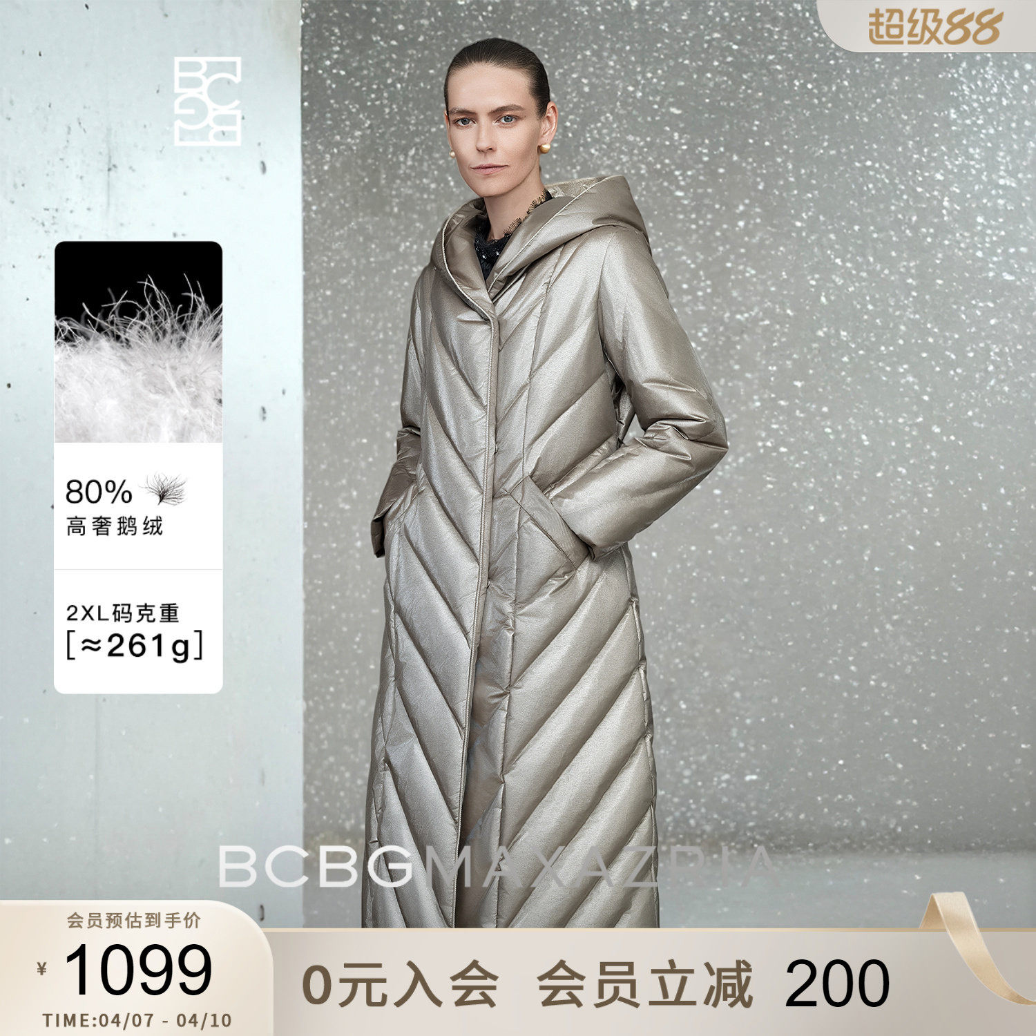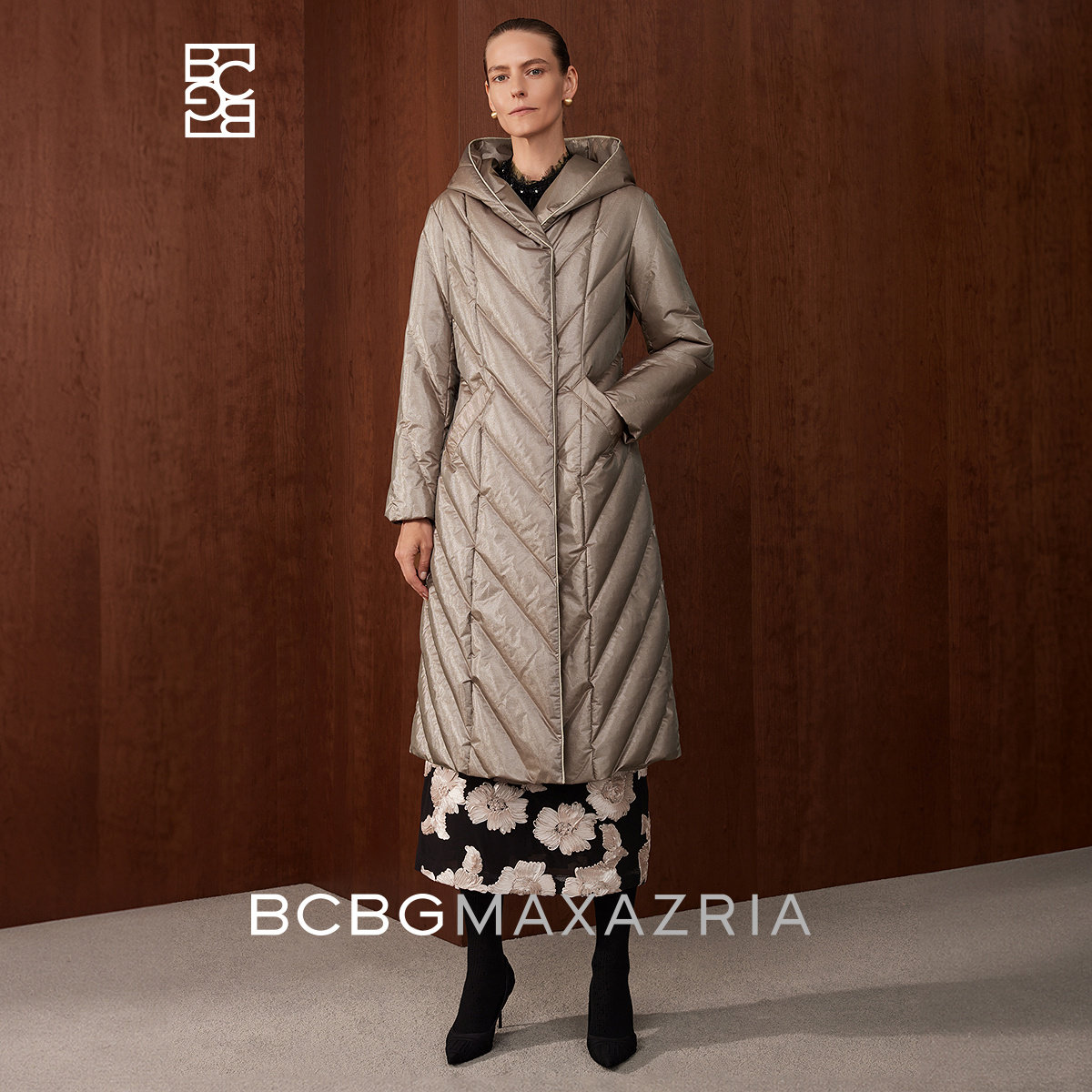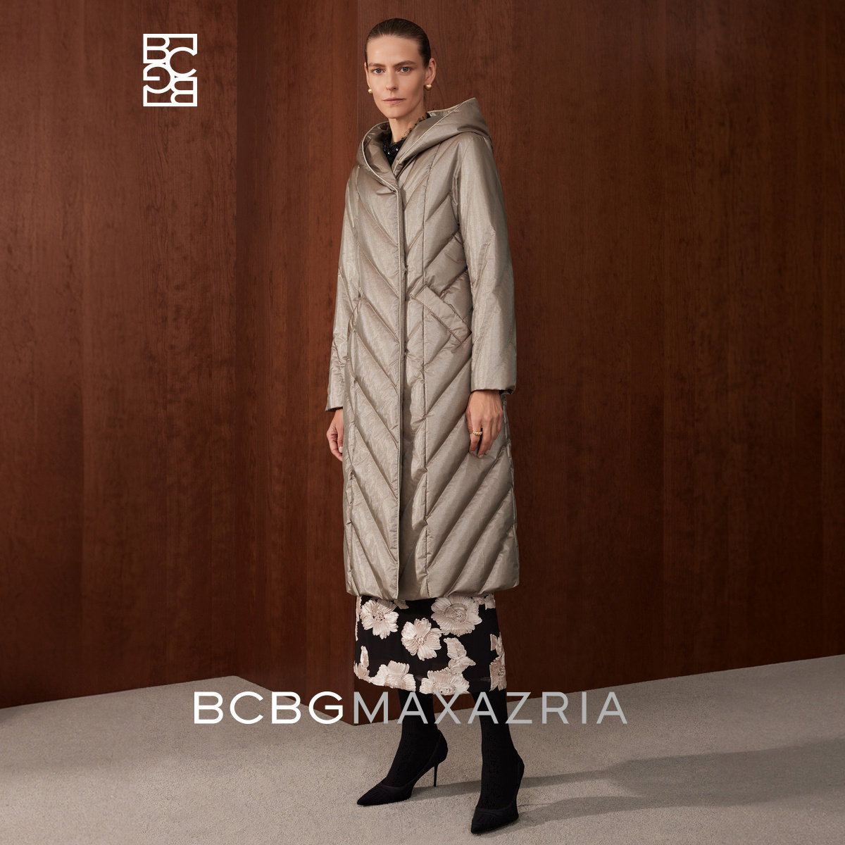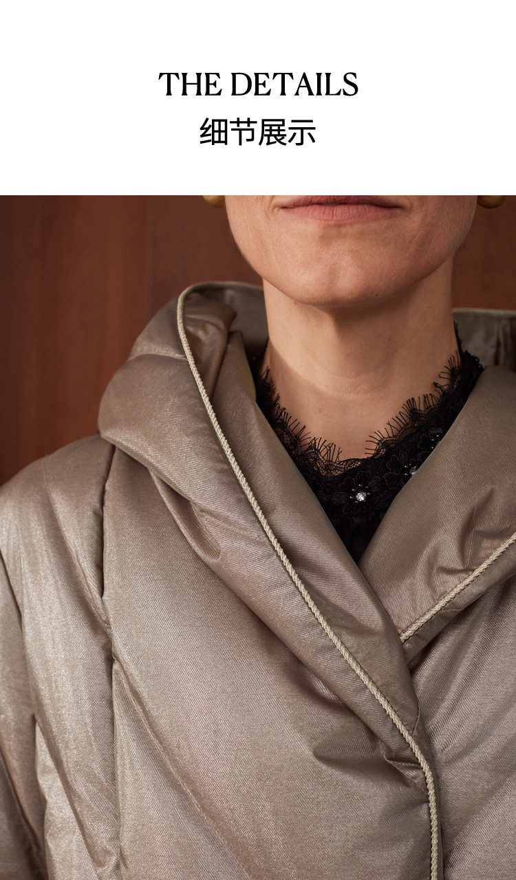 [Высокороскошный гусиный пух] Женская одежда BCBG простая, повседневная, простая, длинный пуховик с капюшоном и рисунком пшеничных ушей на зиму.