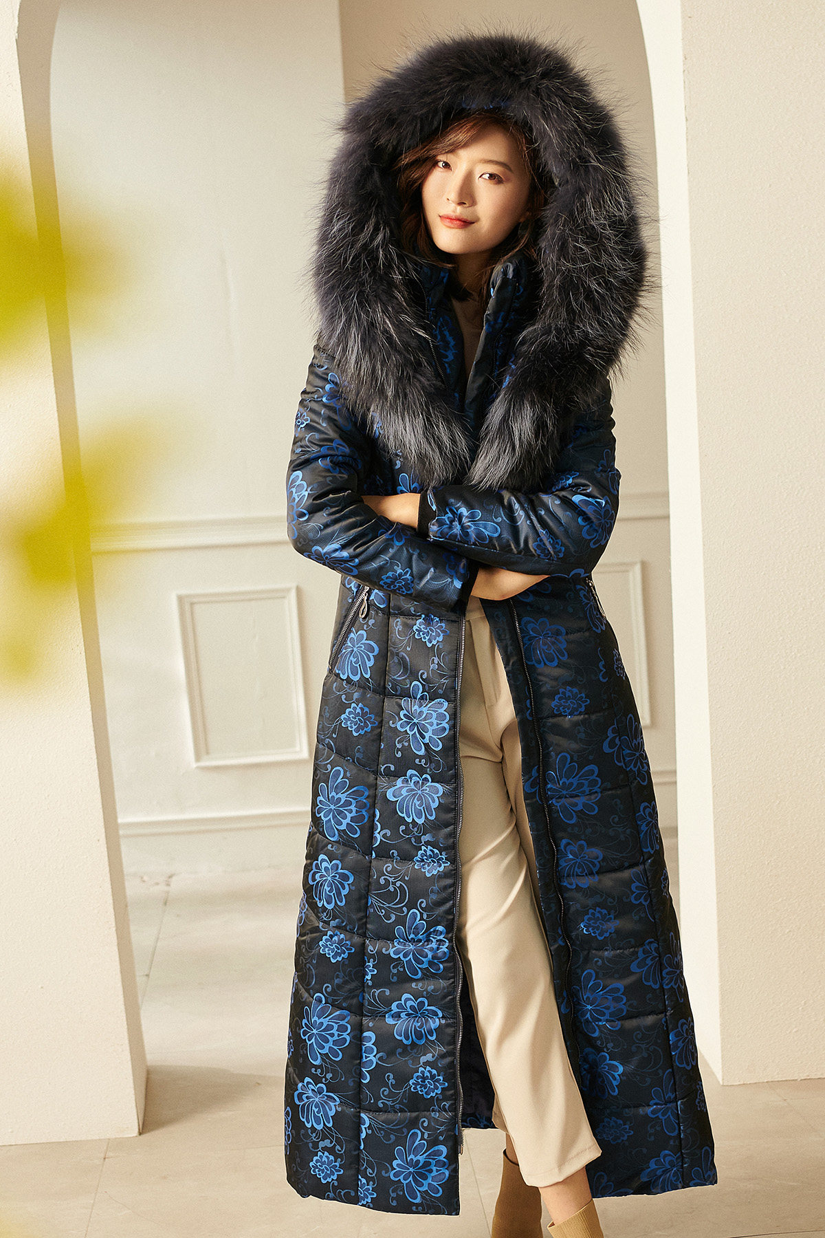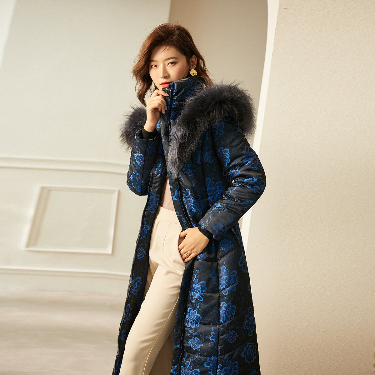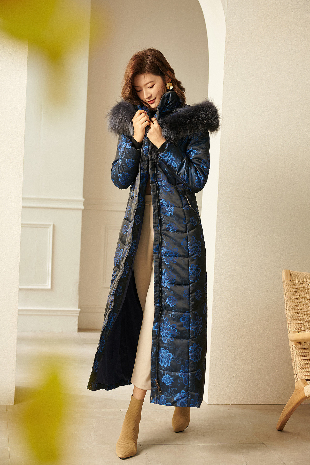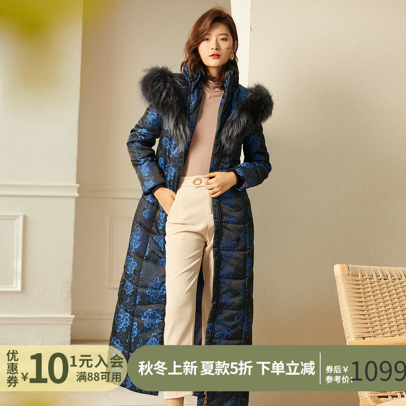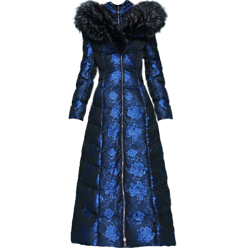 Синий пуховик с капюшоном, наколенники с пухом, по фигуре