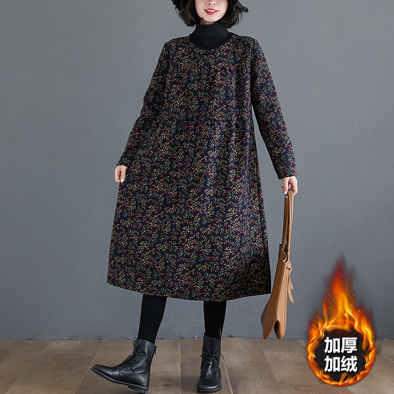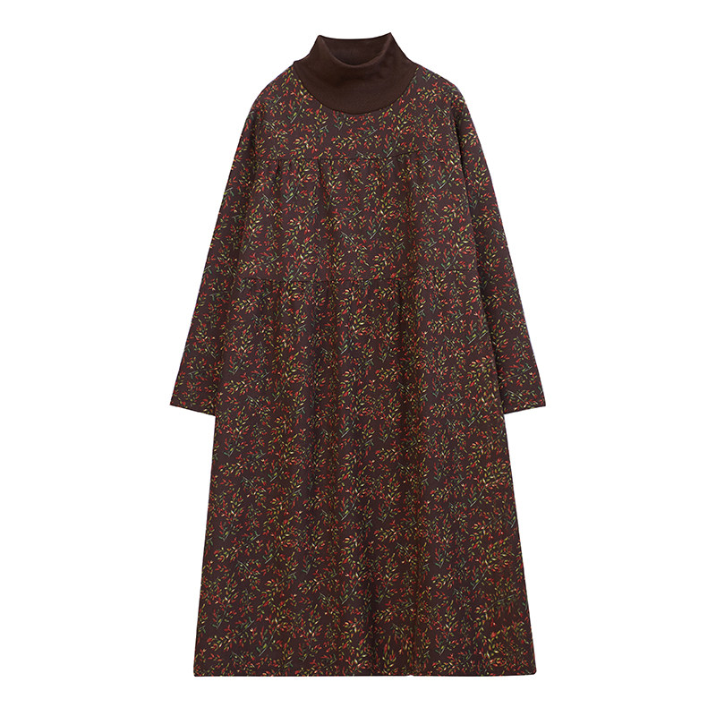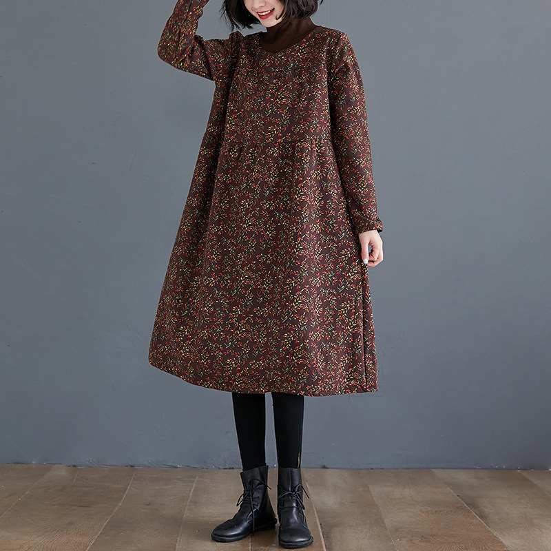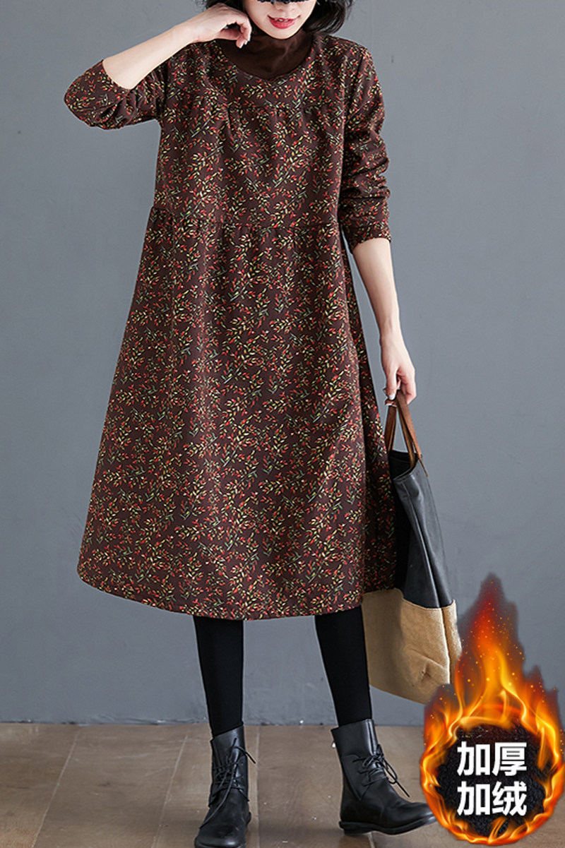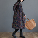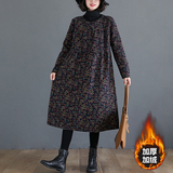 Ретро утепленное демисезонное платье, длинная базовая юбка, цветочный принт, по фигуре, свободный крой, из хлопка и льна