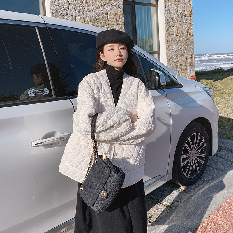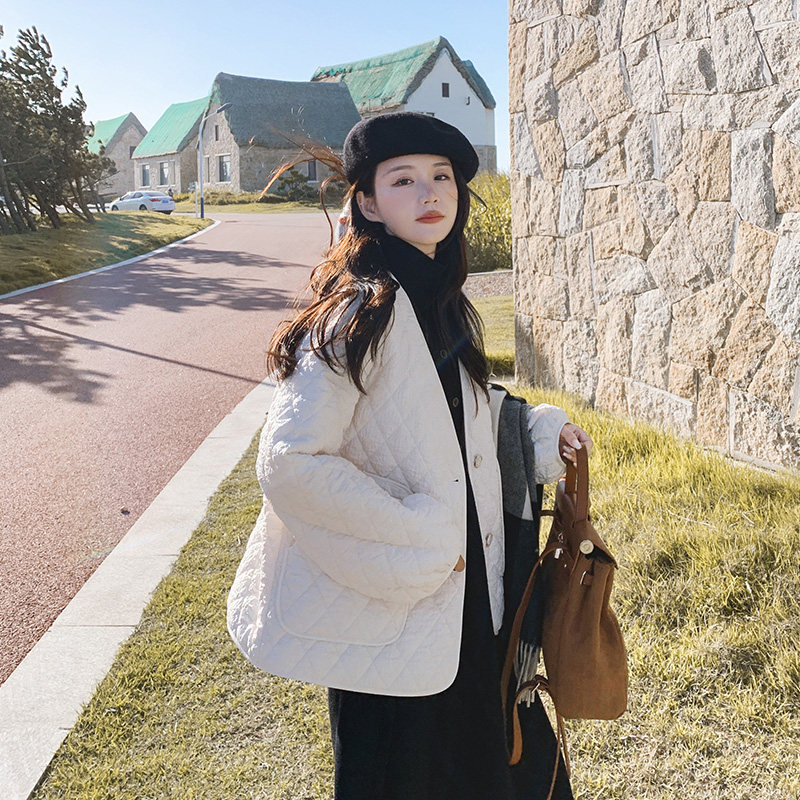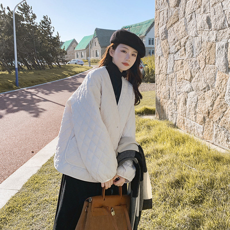 Бежевый демисезонный пуховик с ромбовидным узором с пухом, модная легкая и тонкая куртка, в корейском стиле, свободный крой