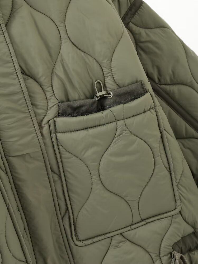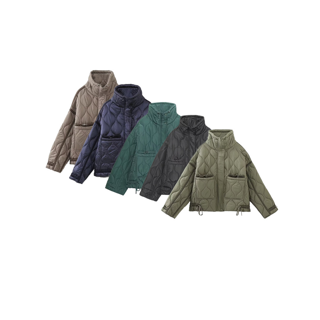 Встаньте короткую куртку, длинные рукава с упругими лентами и регулировкой пряжки.На передней панели существуют двойные сумки, украшенные эластичными полосами и пряжками.Значок -обратный головастик украшения.Подол регулируется эластичной лентой и пряжкой.Передняя молния и закрытие закрыты.