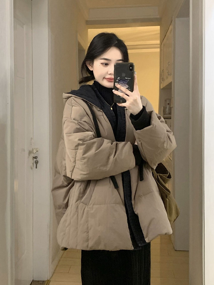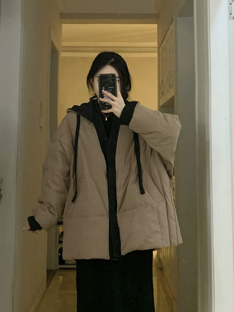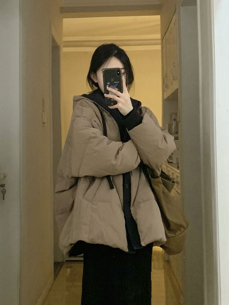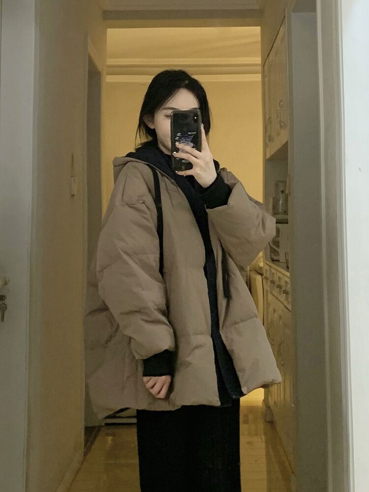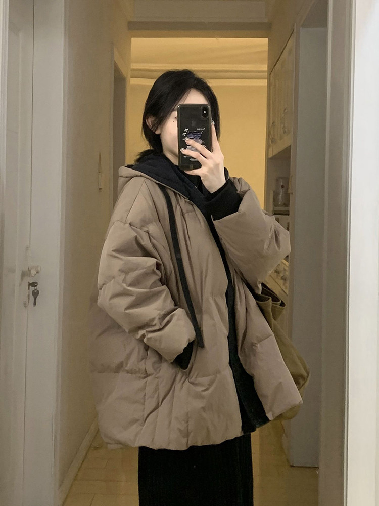 Коричневый пуховик с капюшоном, куртка, джинсы с начесом, в корейском стиле, изысканный стиль