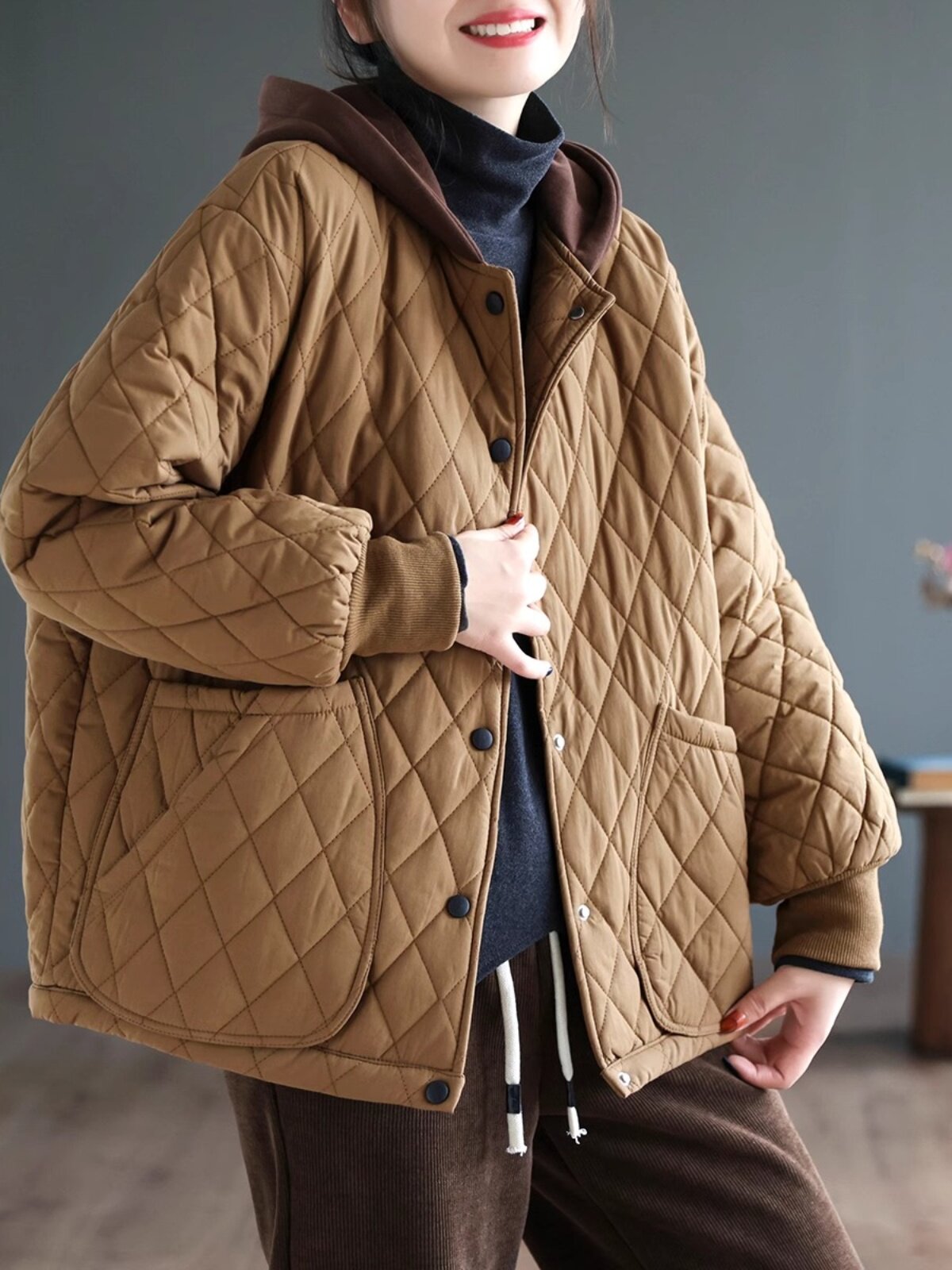 Пуховик с капюшоном, демисезонная утепленная ретро легкая и тонкая куртка с ромбовидным узором с пухом, свободный крой