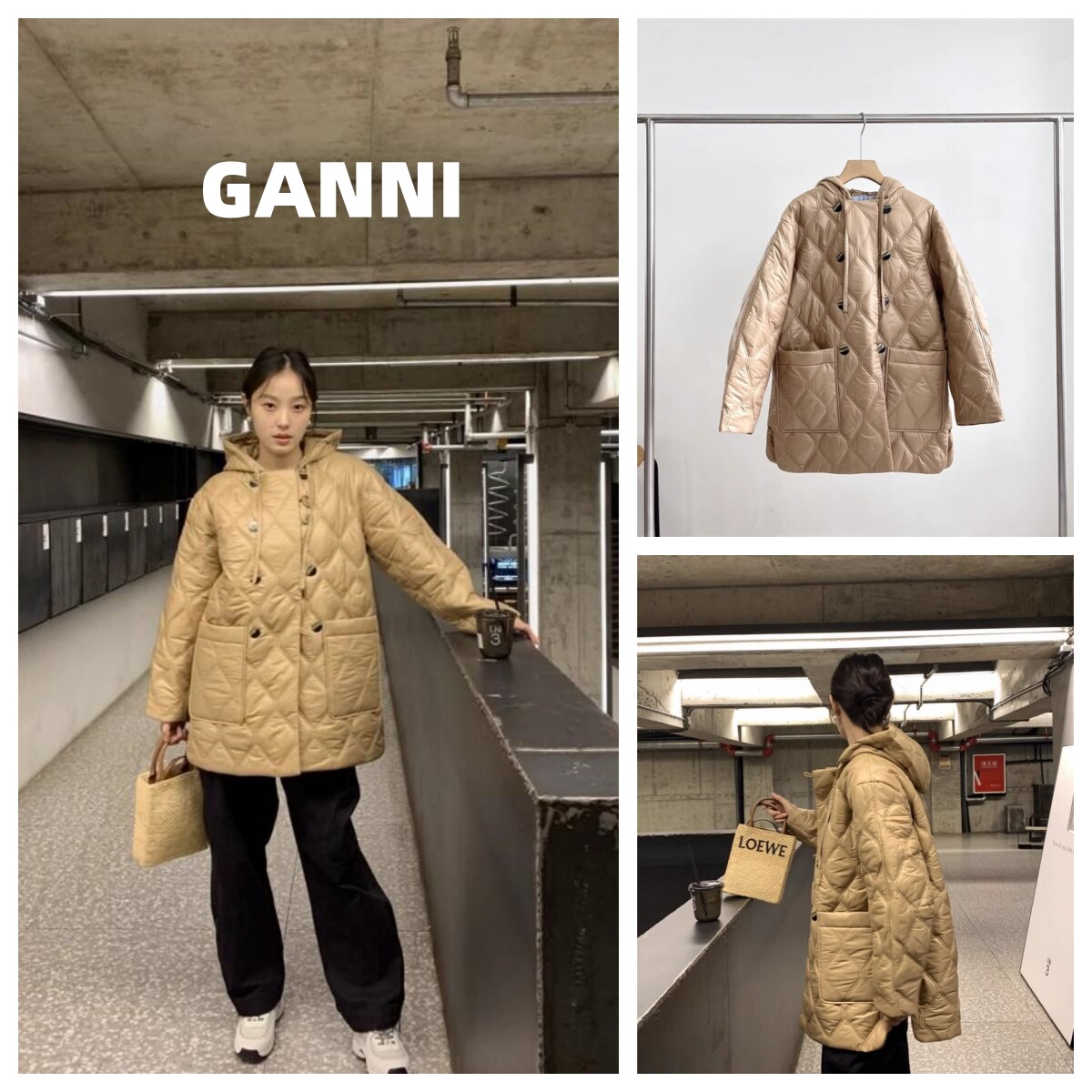 23FW Domestic Spot GANNI двубортная куртка средней длины из светло-коричневого хлопка с капюшоном F7966