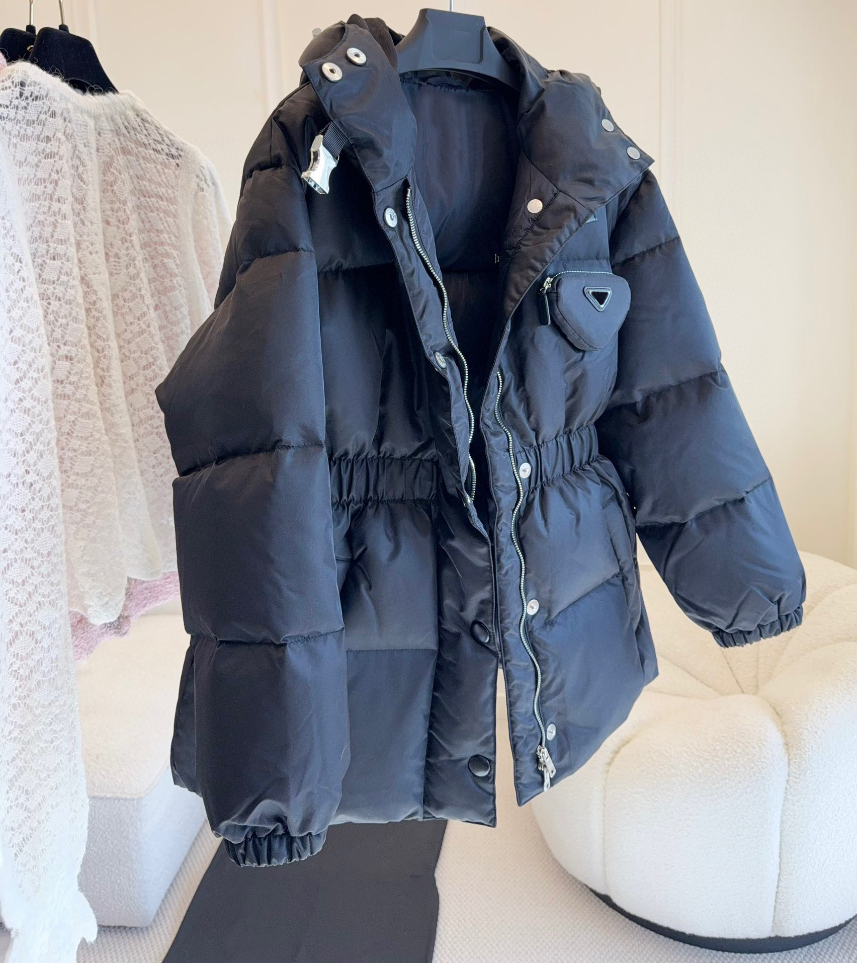 Элитная демисезонная сумка, приталенный корсет, длинный пуховик с капюшоном, коллекция 2023, в стиле Шанель, средней длины
