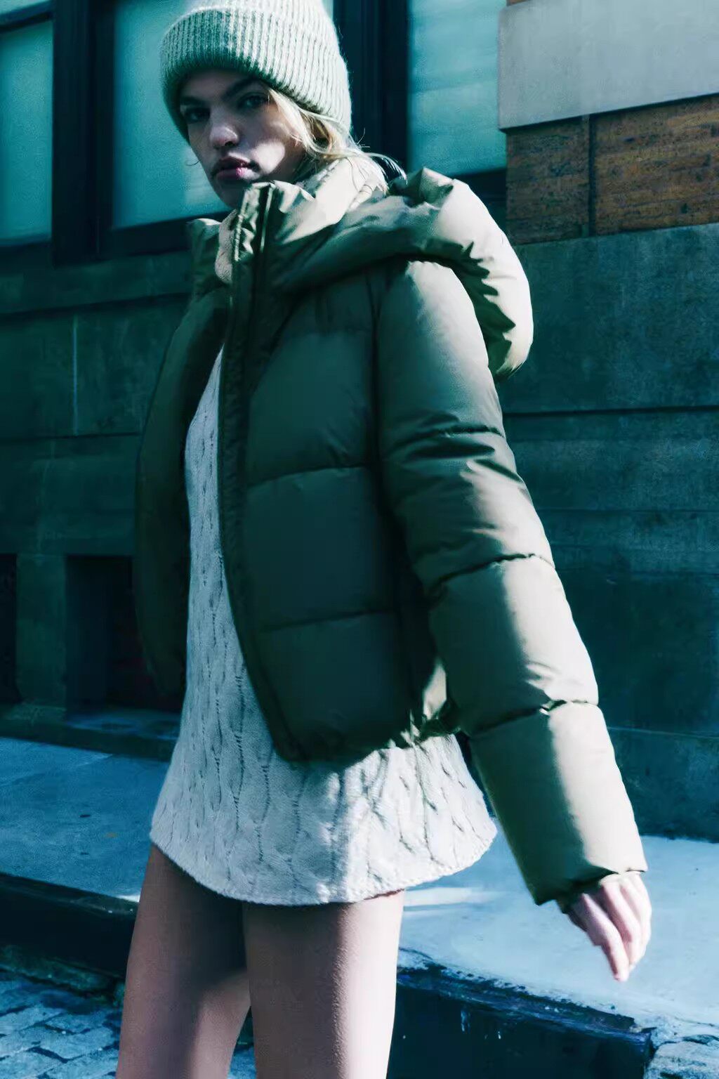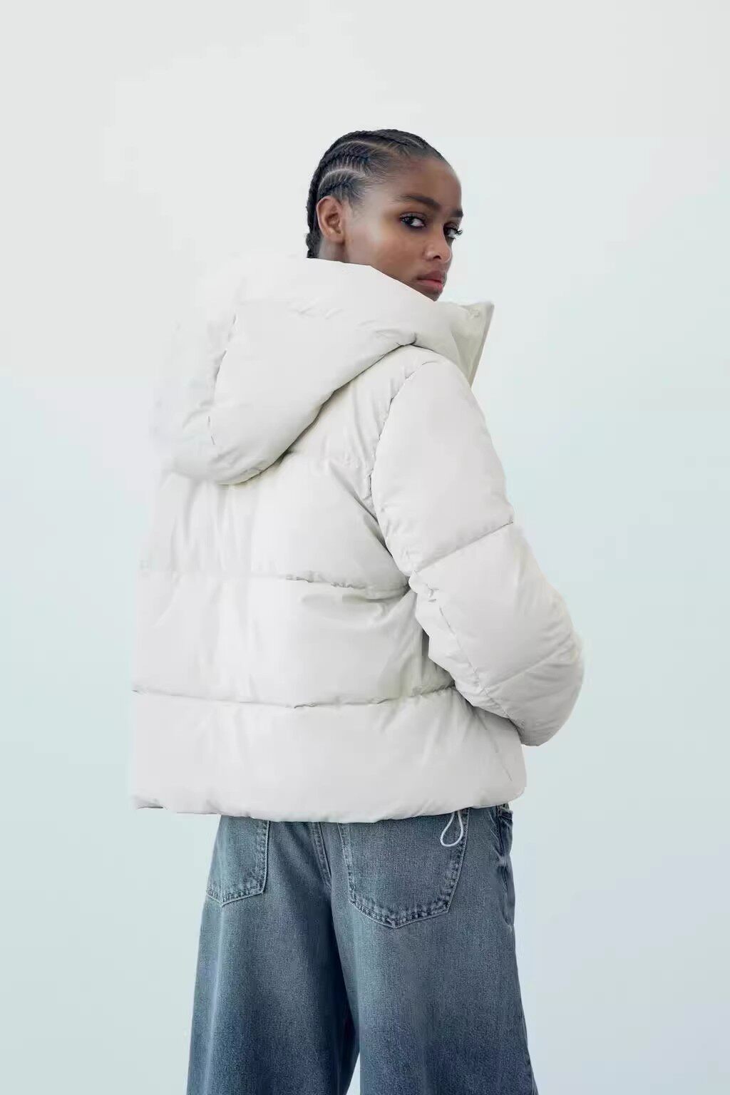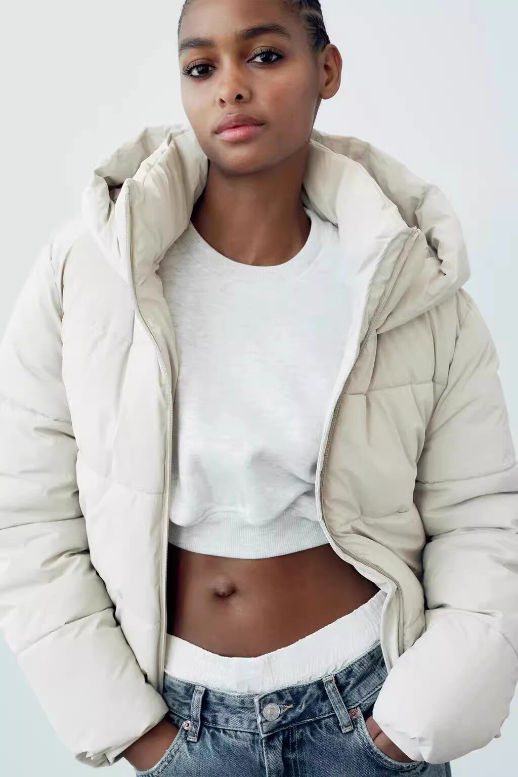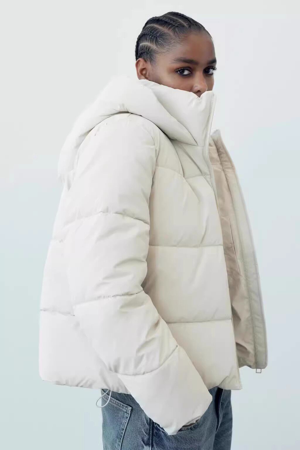Короткий пуховик, теплый и высокий.