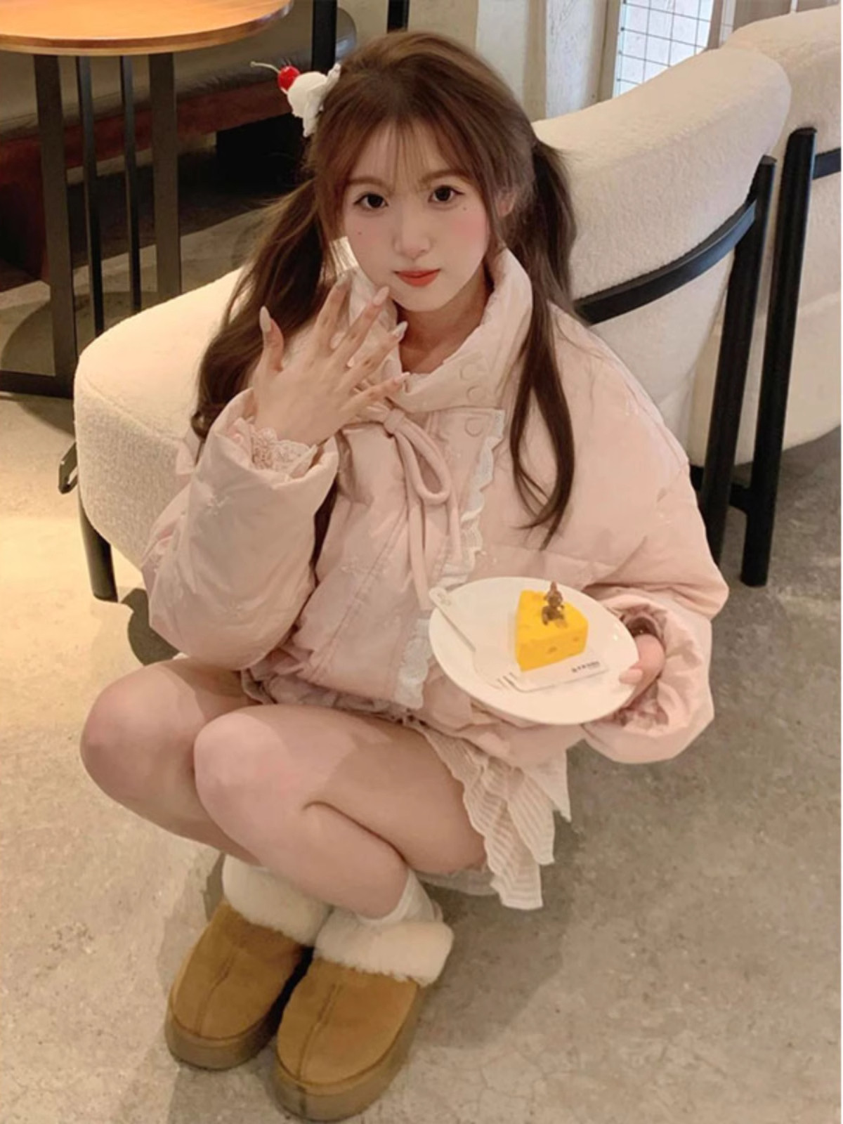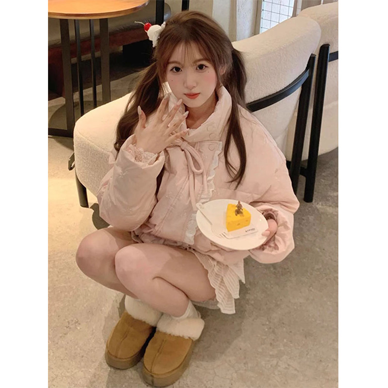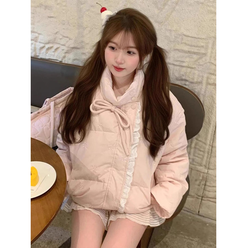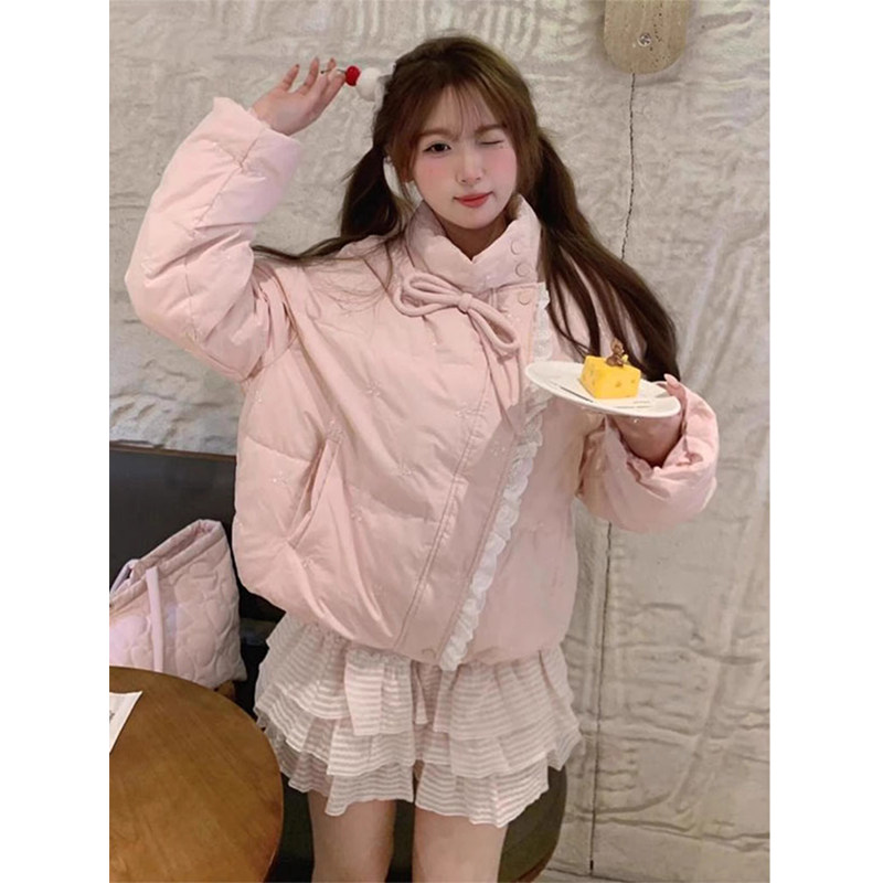 Розовый пуховик с бантиком, зимняя кружевная куртка, 2025 года, в корейском стиле, изысканный стиль