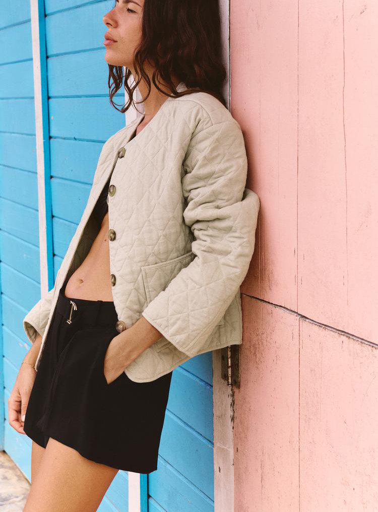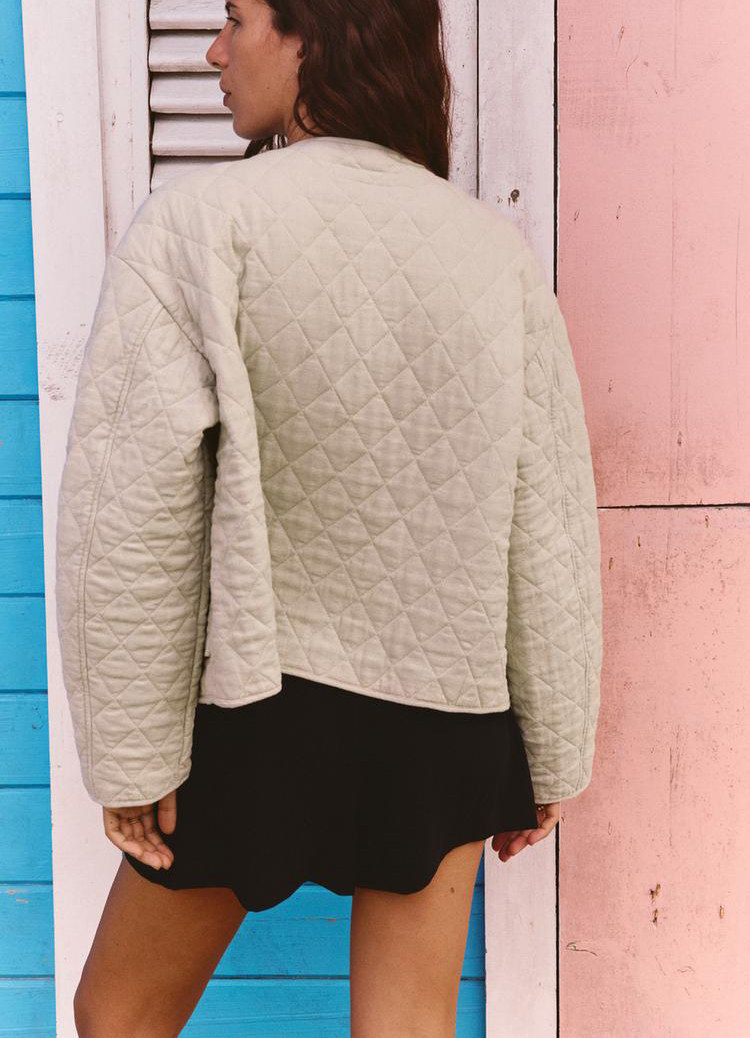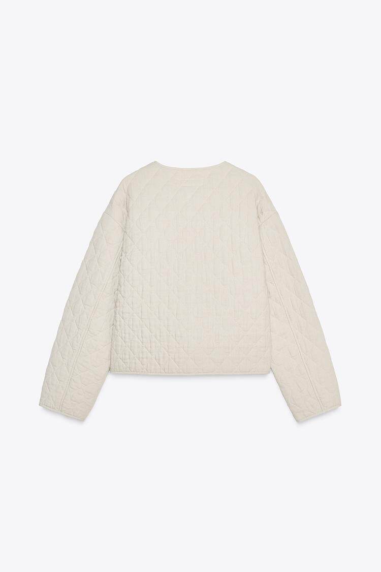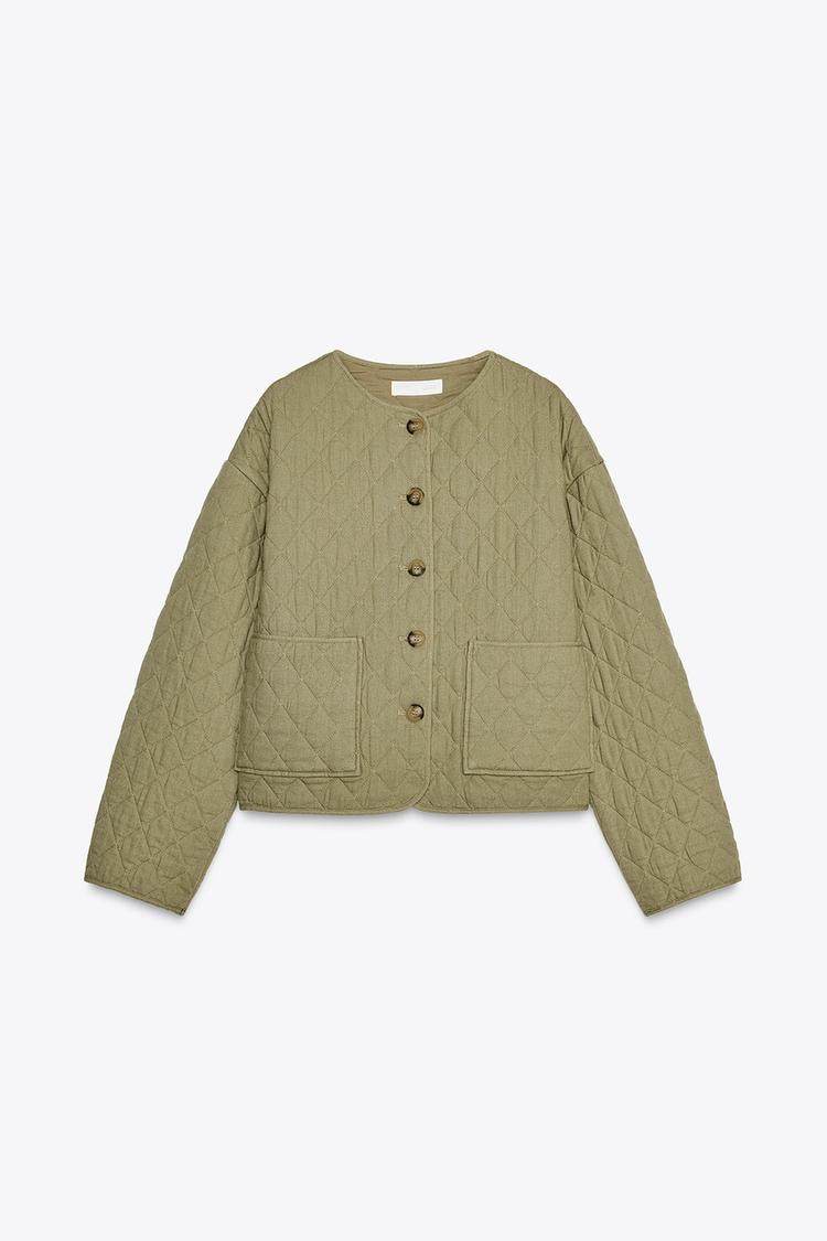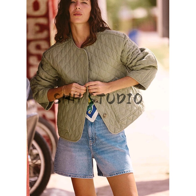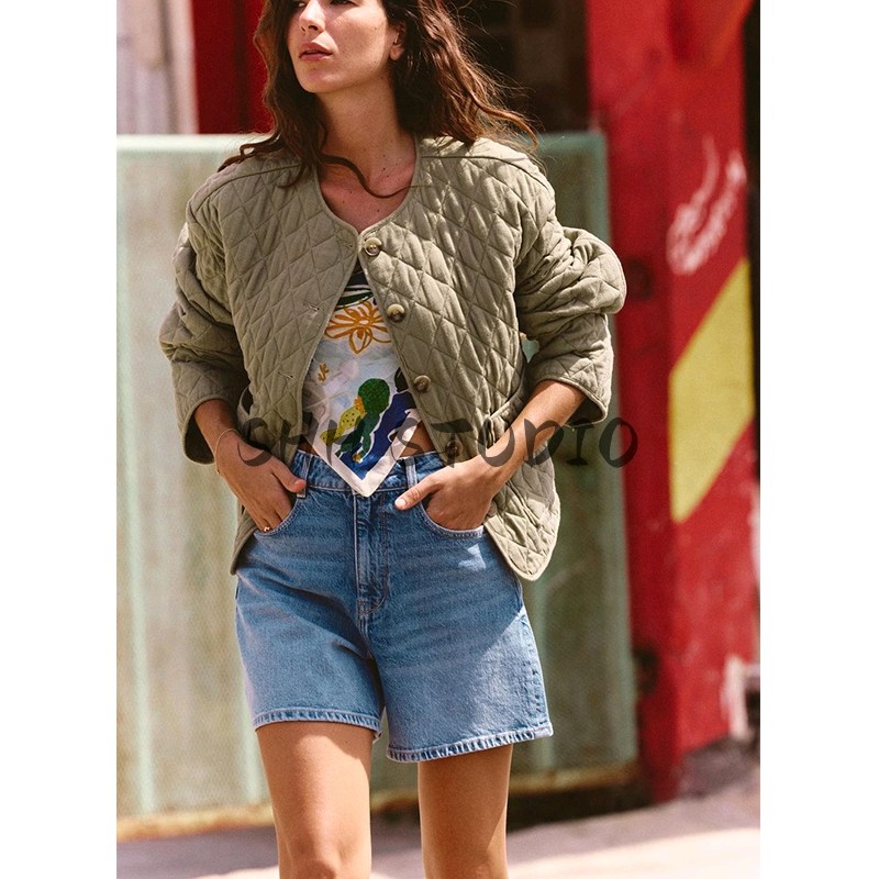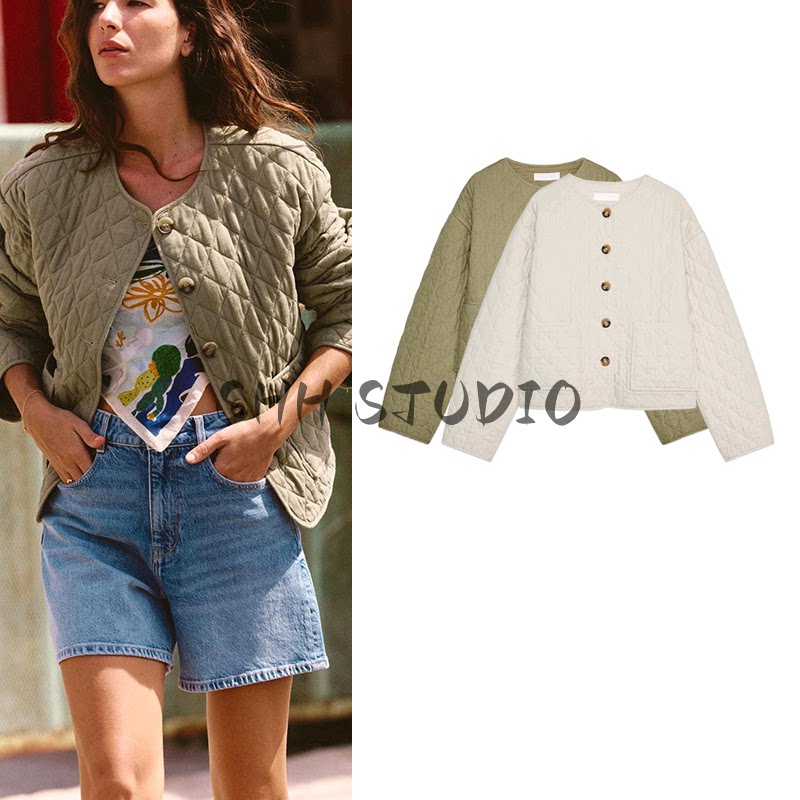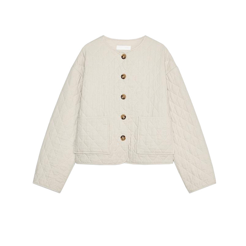 Za Spring Новые женские патч -мешки украшены линией, смешанная круглая шея, хлопчатобумажная куртка с длинным рукавом 1689022