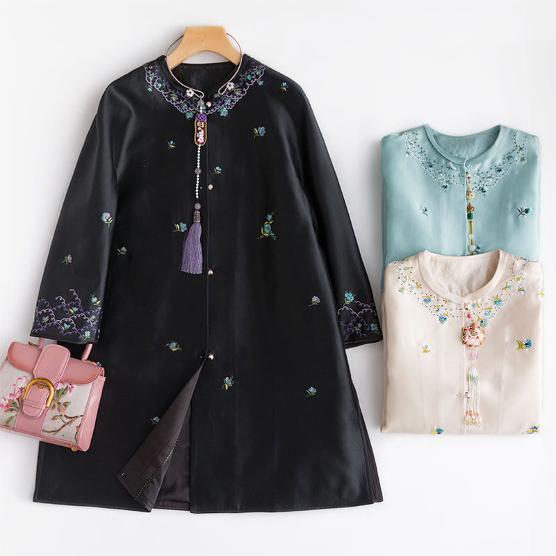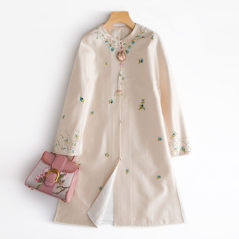 Плащ с круглым воротником, куртка, с вышивкой, длина макси