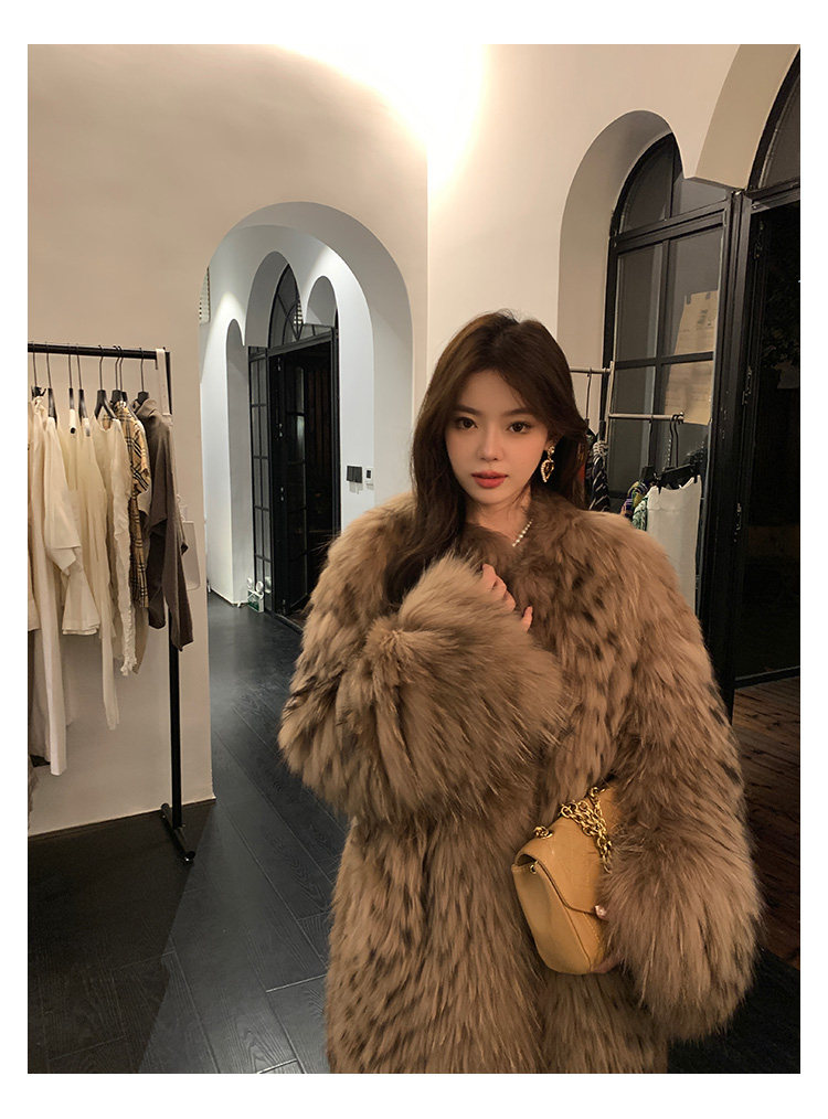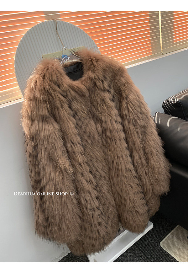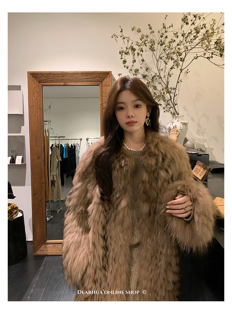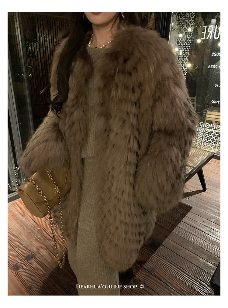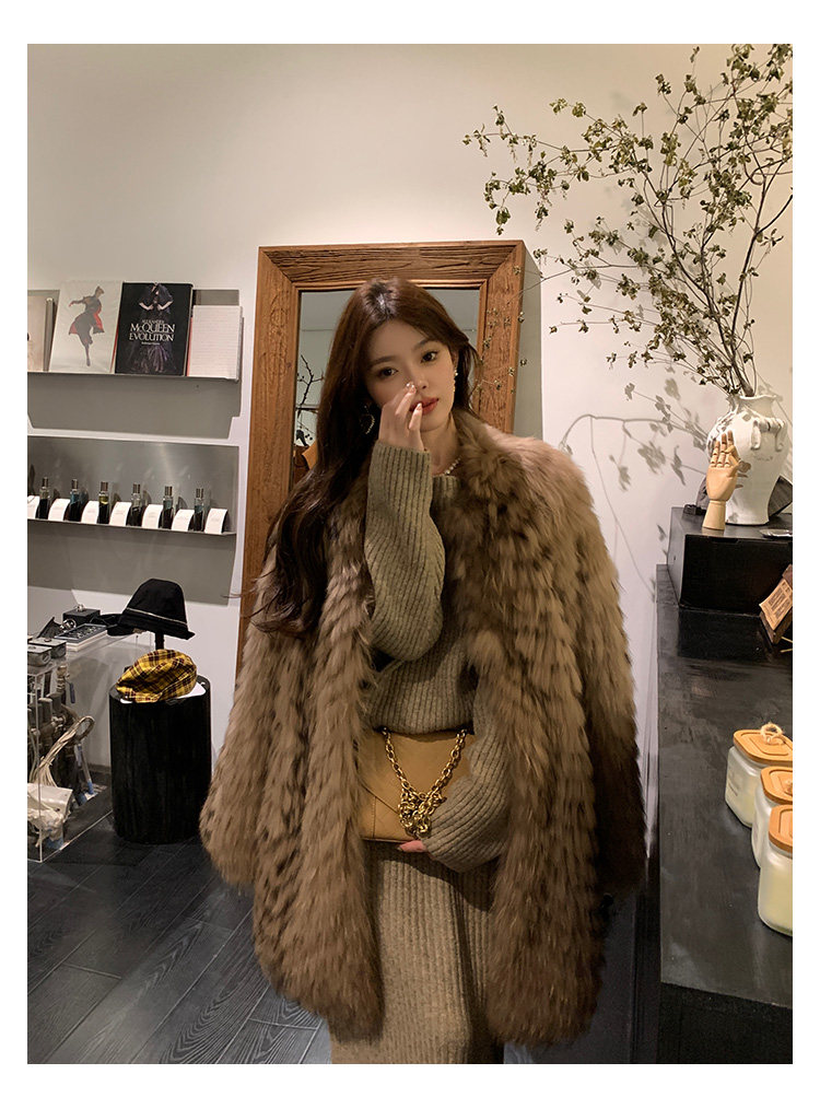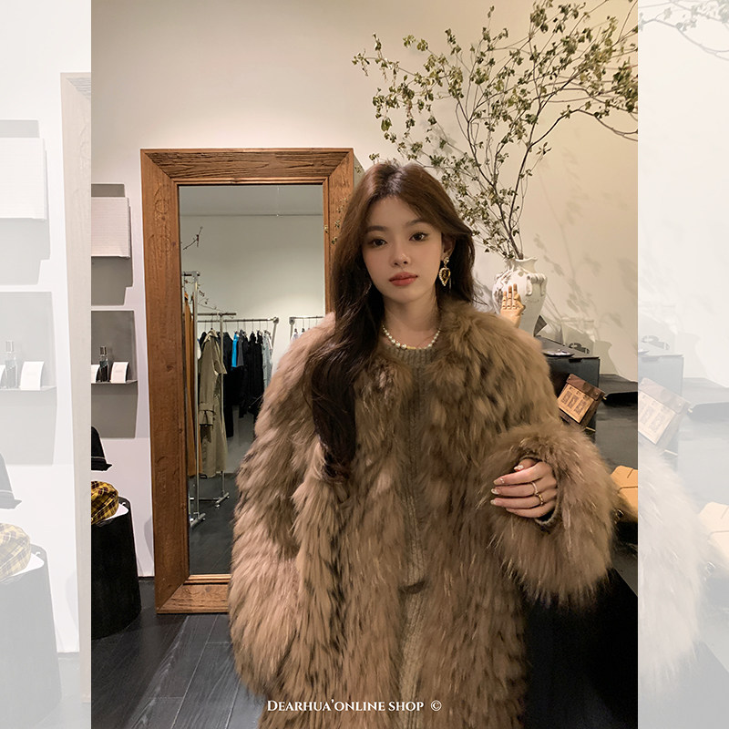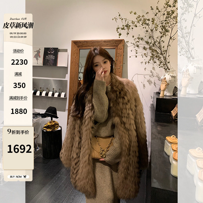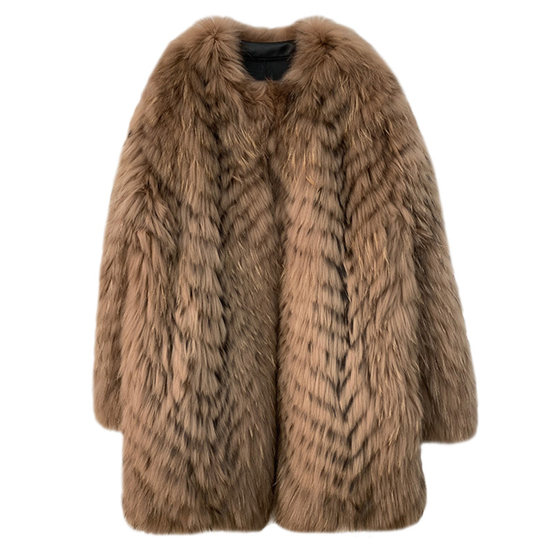 DEARHUA Xiaohuajia женское меховое пальто средней длины в полоску из импортного меха енота "сандаловое дерево со средней нотой"