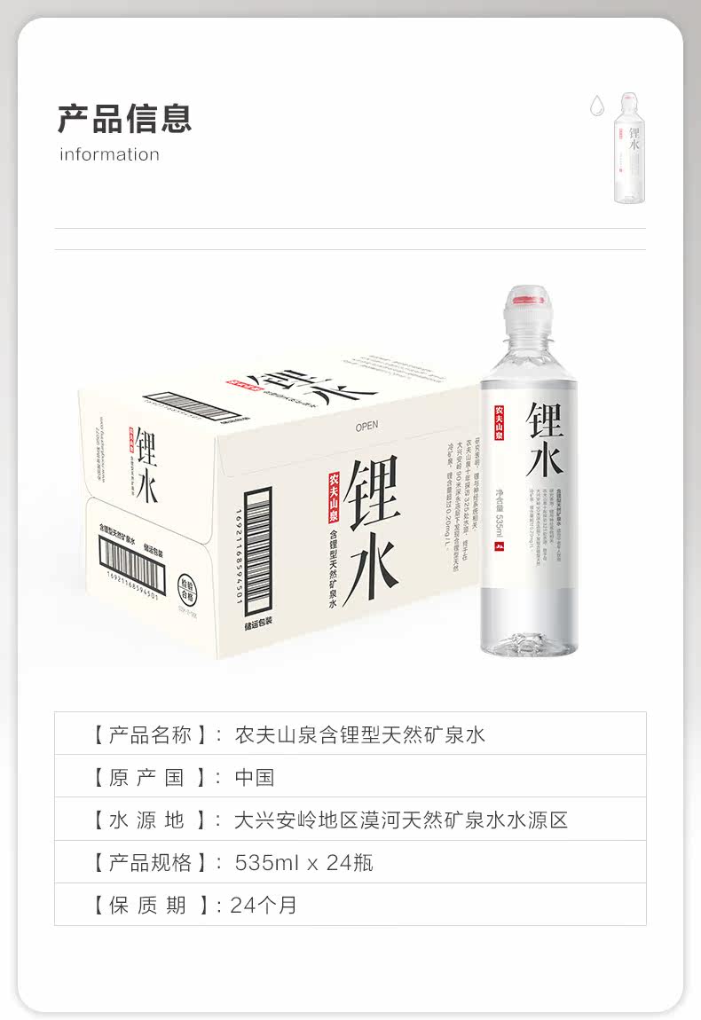 农夫山泉 Литиевая вода содержит литиевый тип натуральная минеральная вода 535 мл*24 бутылки минеральной воды питьевой воды