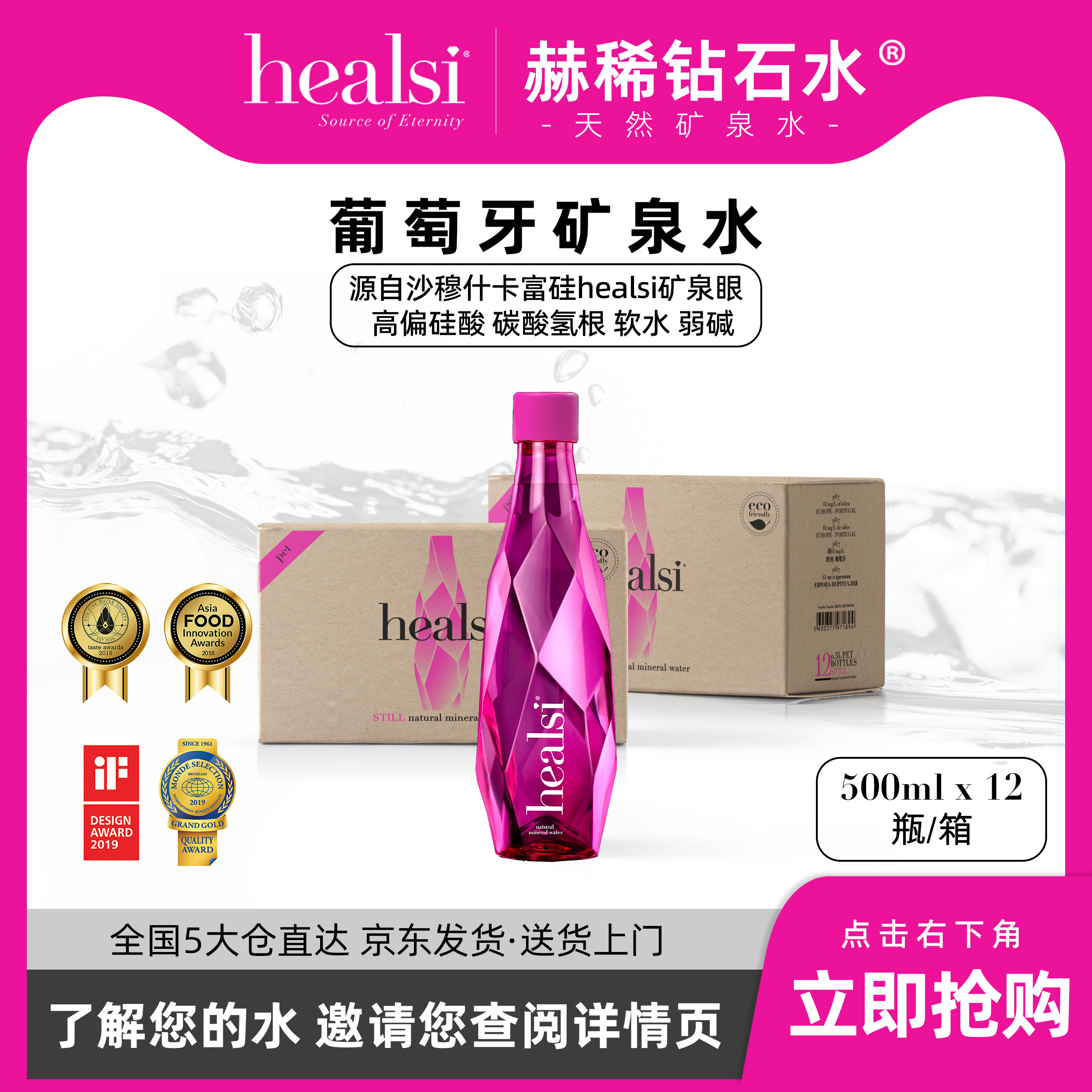 Healsi Portugal Original Импортная натуральная минеральная вода коробка розовая 500 мл 12 бутылок/коробка