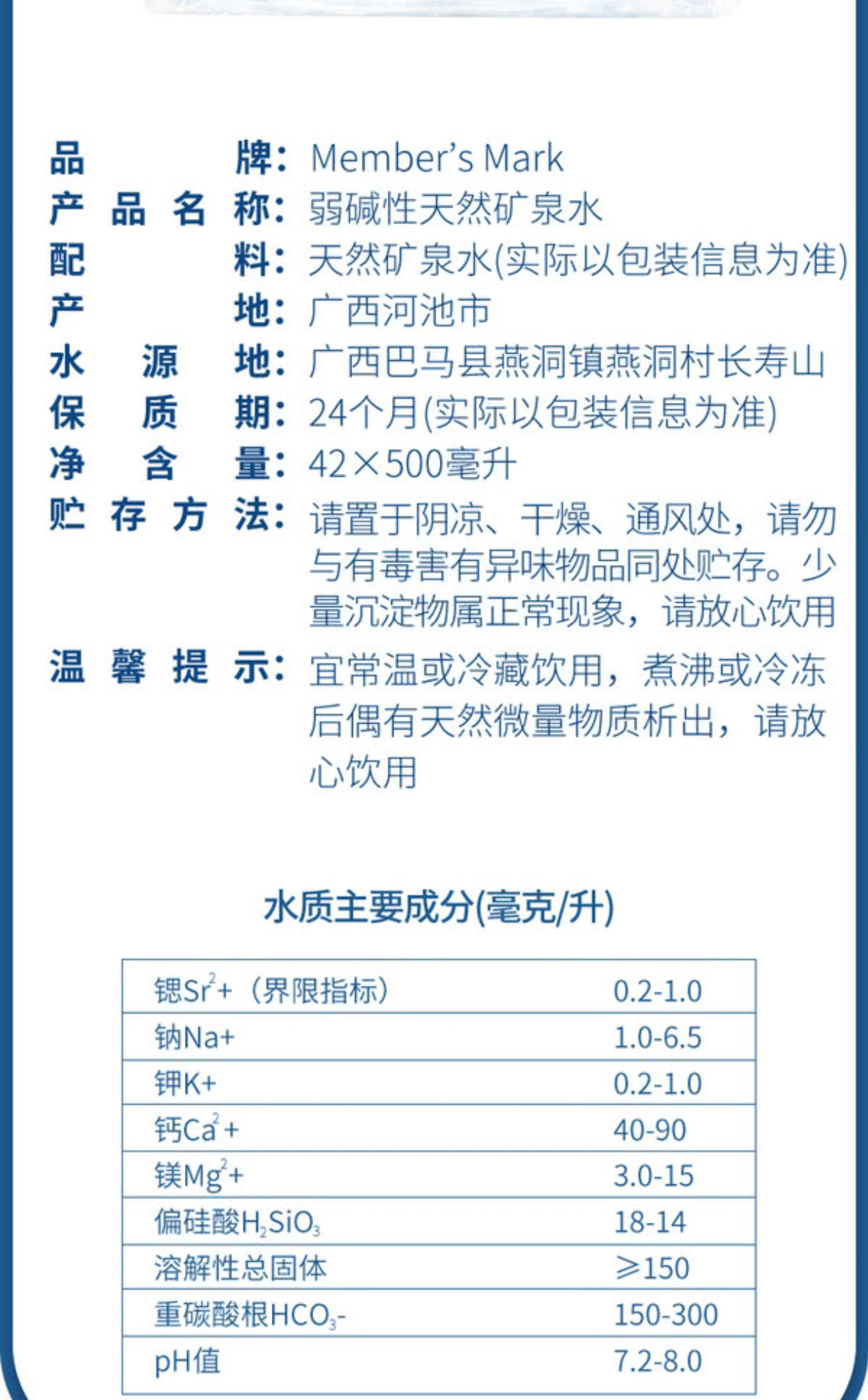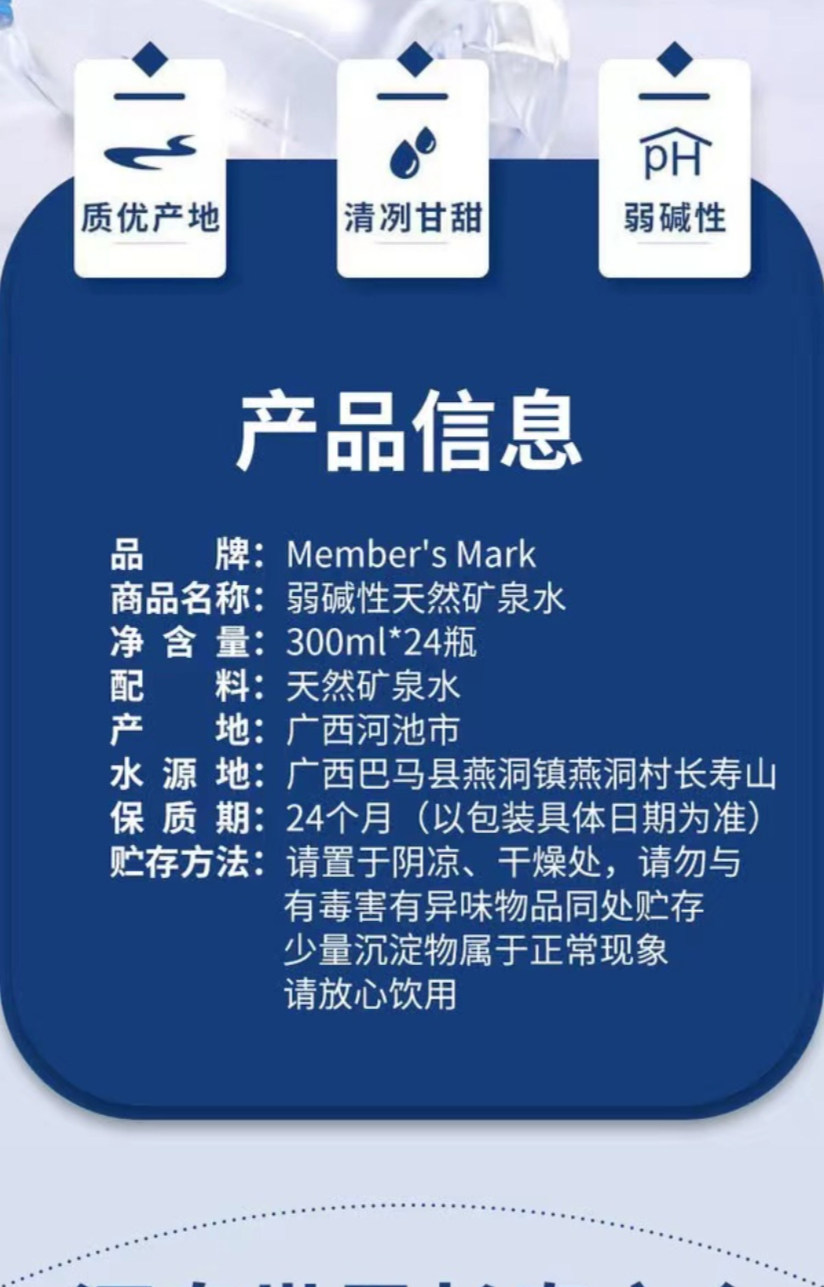| Вкус: | 1 флакон*300мл (бесплатная пробная доставка) (слабощелочная), 4 флакона*300мл (слабощелочная), 12 бутылочек*300мл (слабощелочная), 24 флакона*300мл (упаковка невскрытая) (слабощелочная), 48 флаконов*300мл (целая упаковка) (слабощелочная), 10 бутылочек*500мл (слабощелочная), 20 бутылочек*500мл (слабощелочная), 42 флакона*500мл (целая упаковка) (слабощелочная), 4л*1 бочка (семейный размер) 4000мл (природная питьевая вода неслабощелочная), 4л*4 бочки (семейный размер) 16000мл (природная питьевая вода неслабощелочная), Наличие осадка в природной минеральной воде является нормальным и здравым смыслом. |