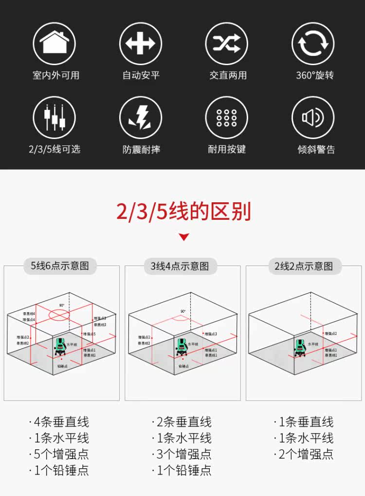| Цвет: | Экономика красный свет 5 линий (защитные очки+сухое электричество, Экономическая линия красного света 3 (защитные очки+сухое электричество, Экономическая линия красного света 2 (защитные очки+сухое электричество, Зеленый свет 5 линий (защитные очки+литийные батареи), Зеленый свет 3 (защитные очки+литийные батареи), Зеленый свет 2 (защитные очки+литийные батареи) |