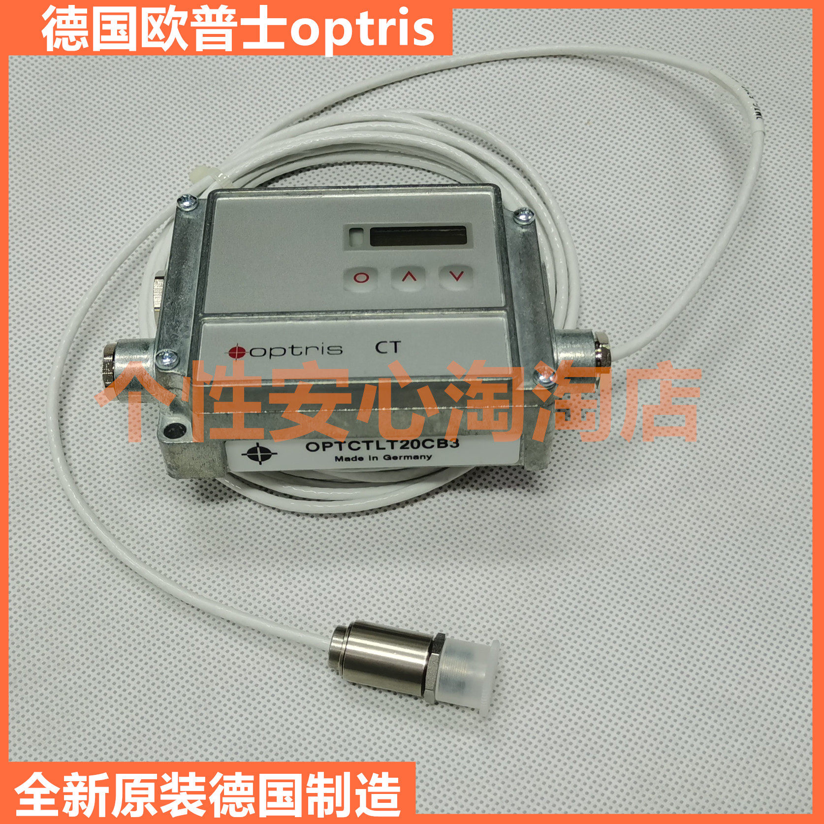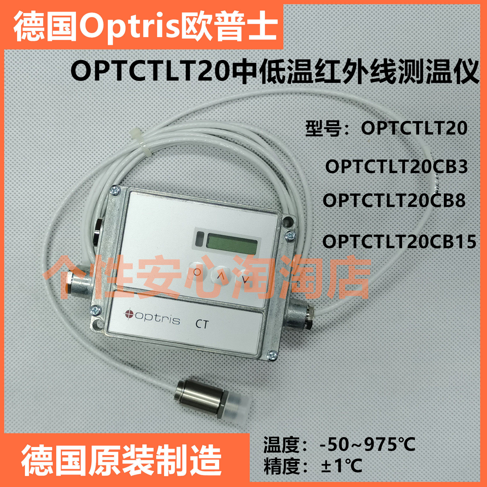 Optris CT20, полное имя Optris CTLT20, помеченный как OPTCTLT20 на приборе, стандартной конфигурацией является термометр CT20, а подключаемый кабель составляет 1 метр; Если это нестандартный кабель, добавьте числа CB+ после исходной модели; такие как OPTCTLT20CB3,OPTCTLT20CB8, OPTCTLT20CB15 и т. Д.!