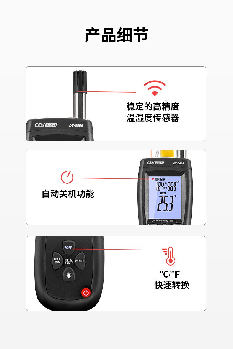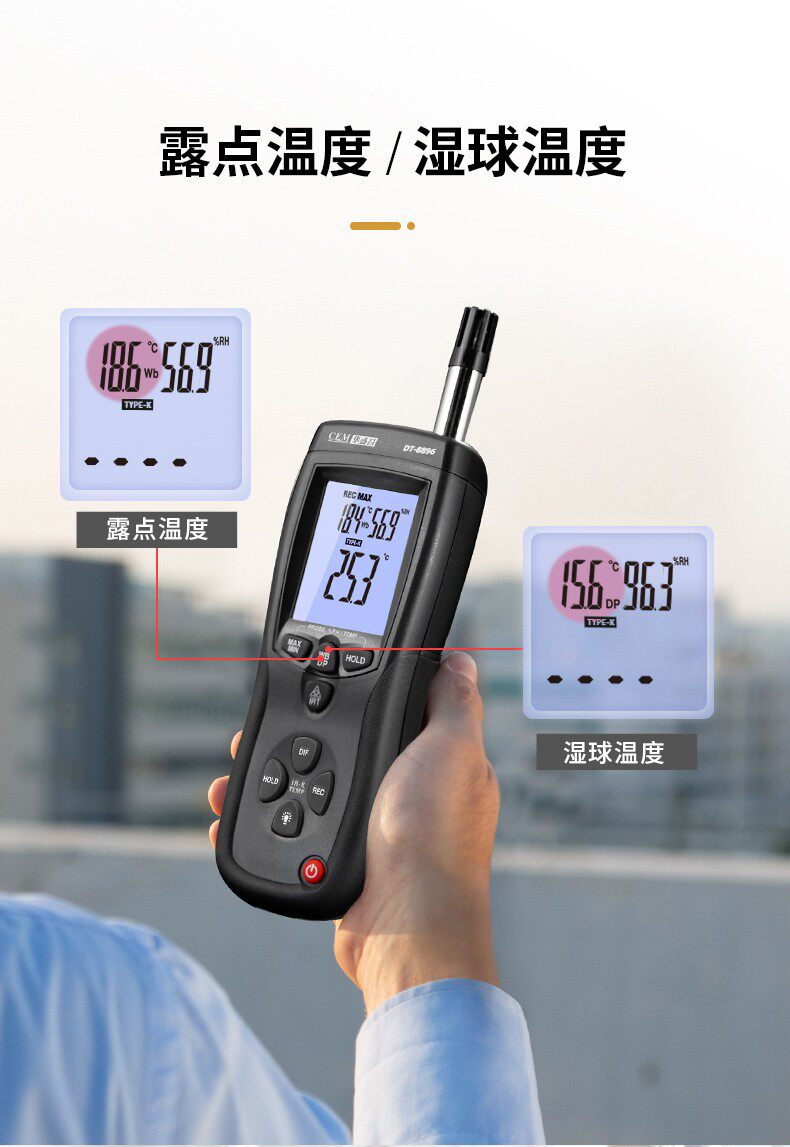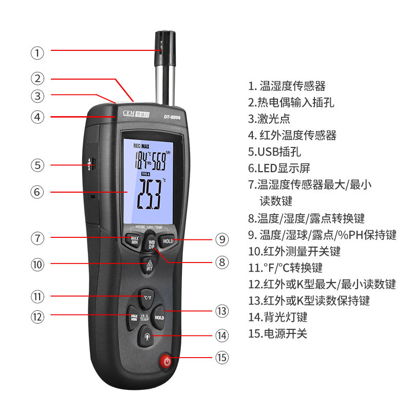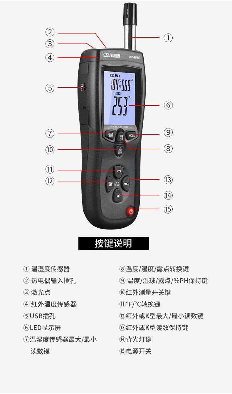 CEM Huashengchang DT-8896 Термопара термопары термопары Термометр Трех-в одном Профессиональная температура и влажность Инфракрасная точка росы.