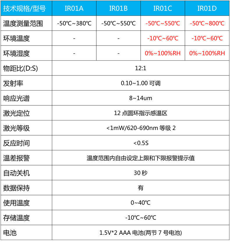 | Цвет: | IR01A Стандарт-50 ~ 380 ℃, IR01B Стандарт-50 ~ 550 ℃, IR01C является стандартным-50 ~ 550 ℃ (с температурой и влажностью), IR01D Стандарт-50 ~ 800 ℃, IR02A Стандарт-50 ~ 800 ℃, Обновления IR02B стандартные-50 ~ 800 ℃, IR02C Luxury Model-это стандарт-50 ~ 800 ℃ |