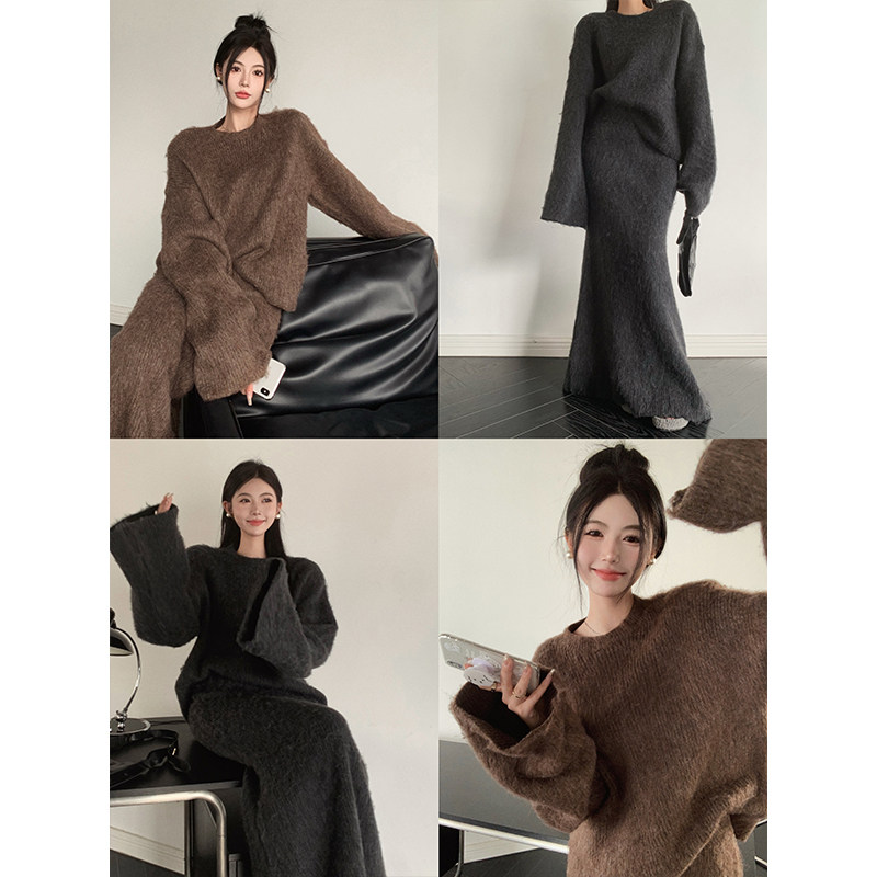 Ретро мегафон, демисезонный свитер, длинная юбка, комплект, в корейском стиле, высокая талия, средней длины