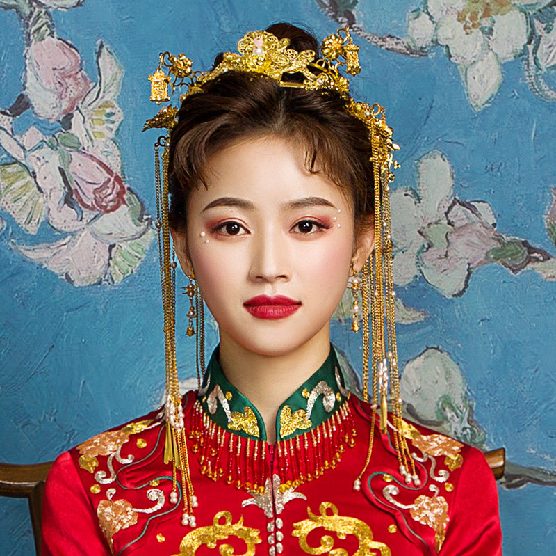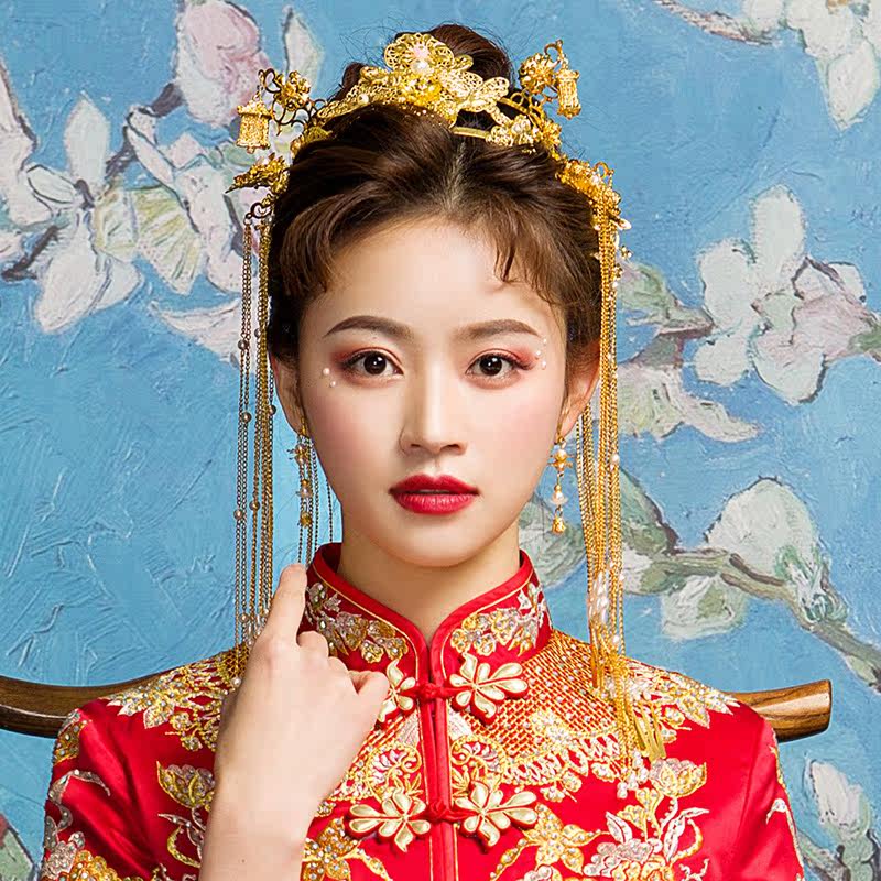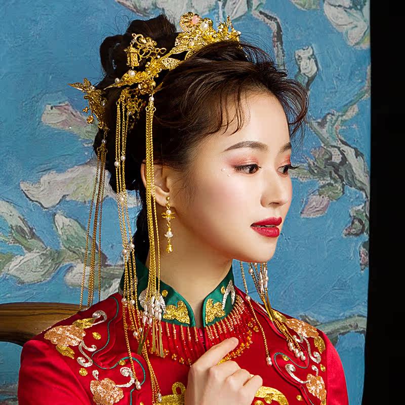 Красная тиара, серьги, традиционный свадебный наряд Сюхэ с кисточками, платье, аксессуар для волос, ювелирное украшение, китайский стиль
