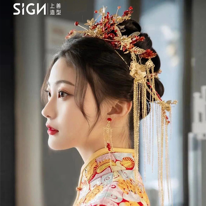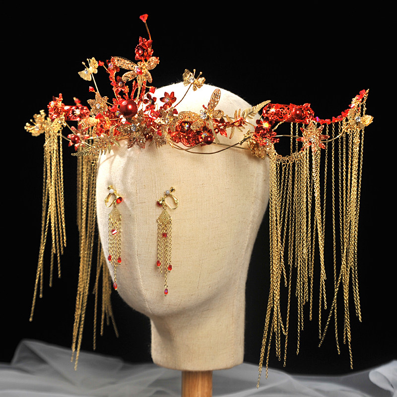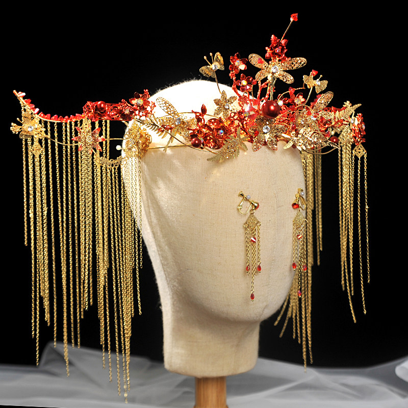 Свадебное платье для невесты, традиционный свадебный наряд Сюхэ, золотой аксессуар для волос с кисточками, реквизит для фотографии, вечернее платье