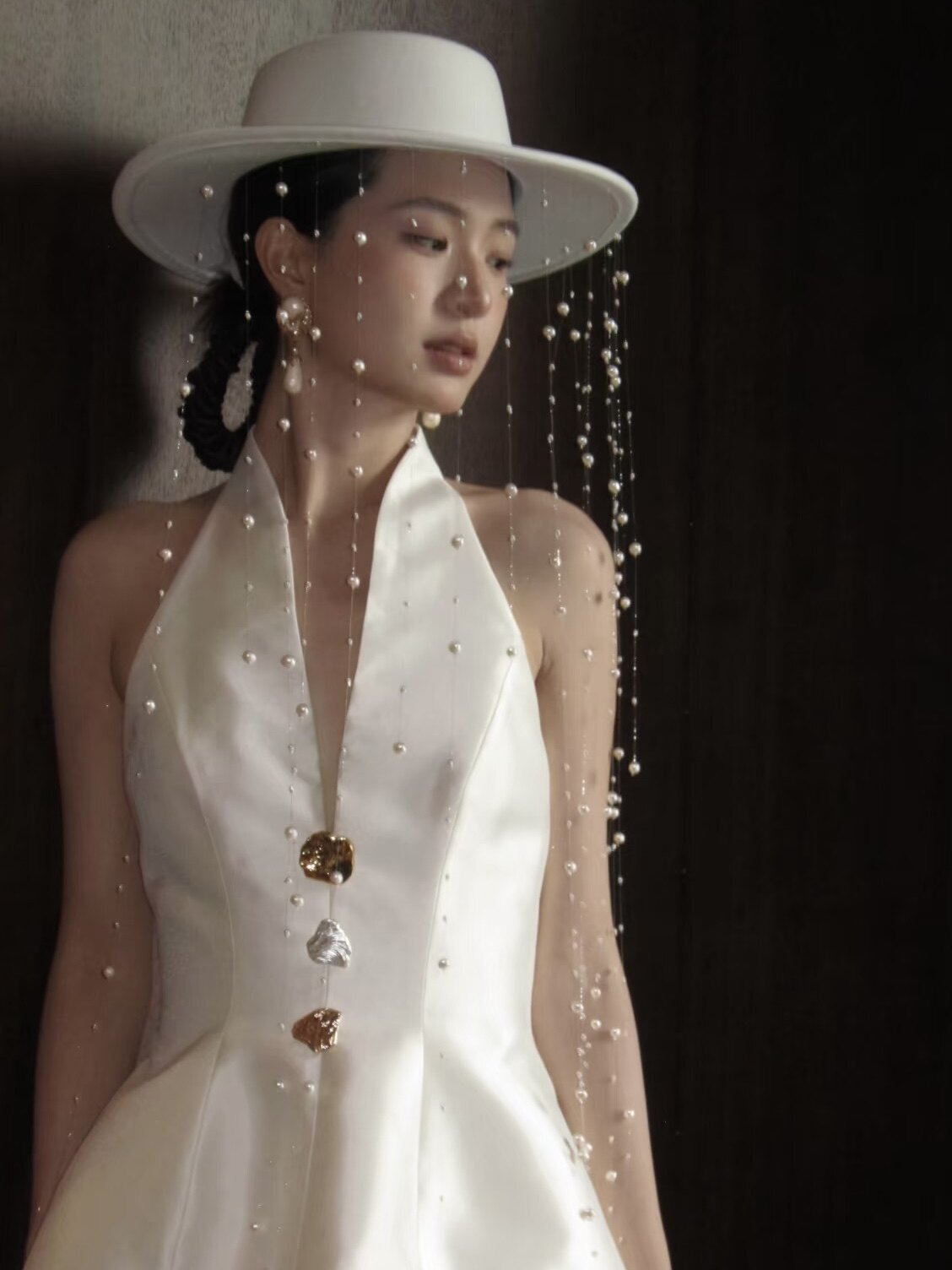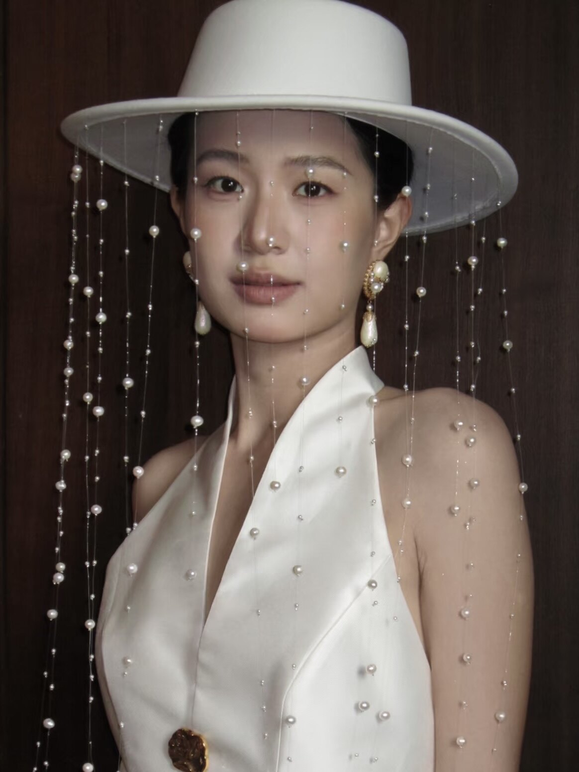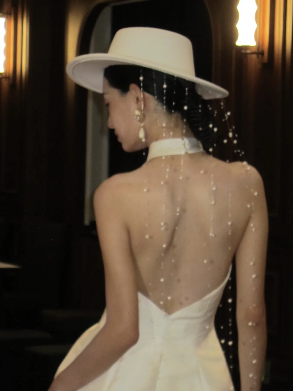Свадебная шляпа с кисточками и жемчугом. Платье для подиума. Сценическое представление. Уличная фотография. Ретроспектива. Элегантный темперамент. Роскошный женский цилиндр.