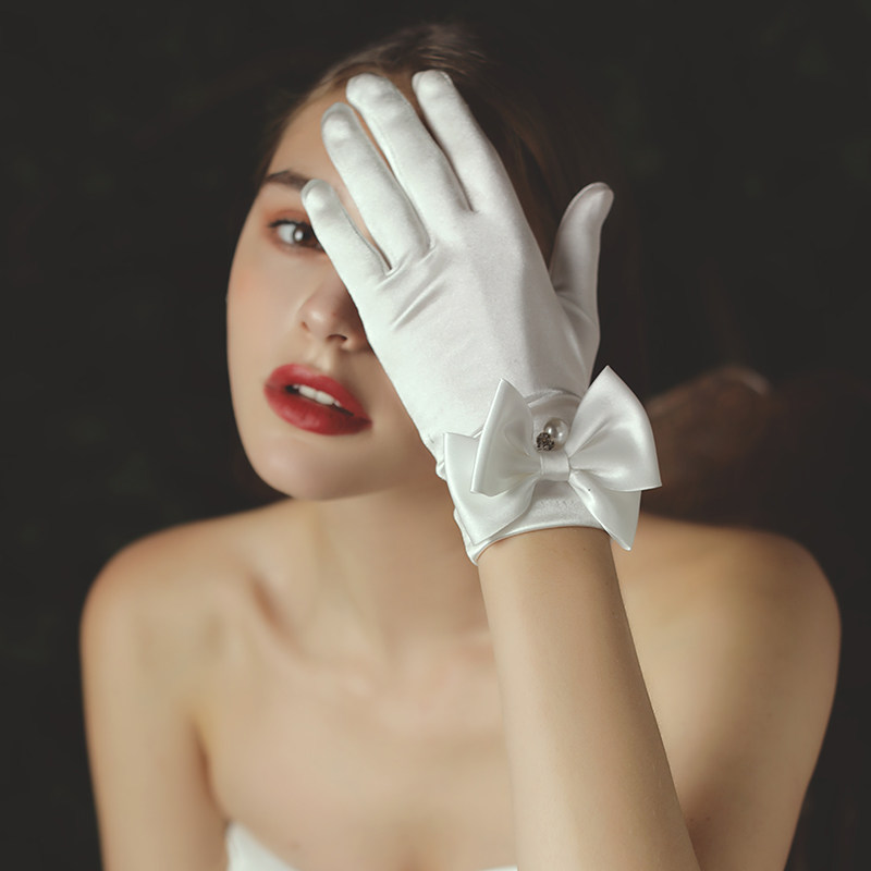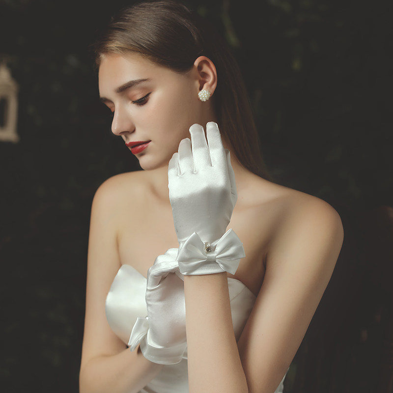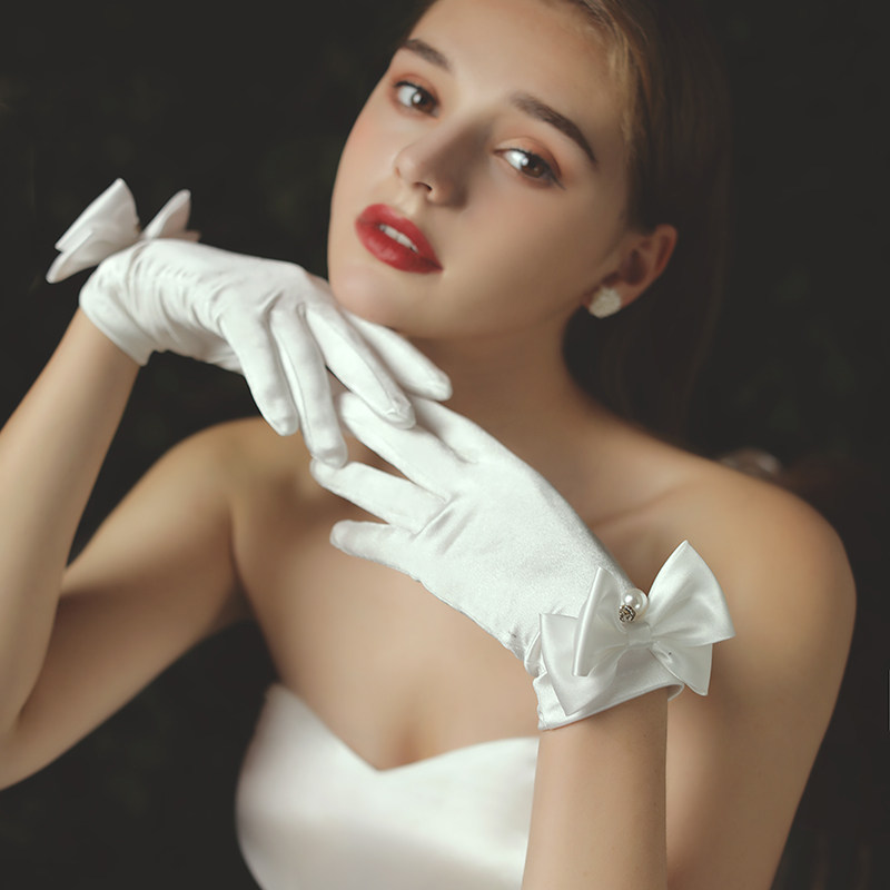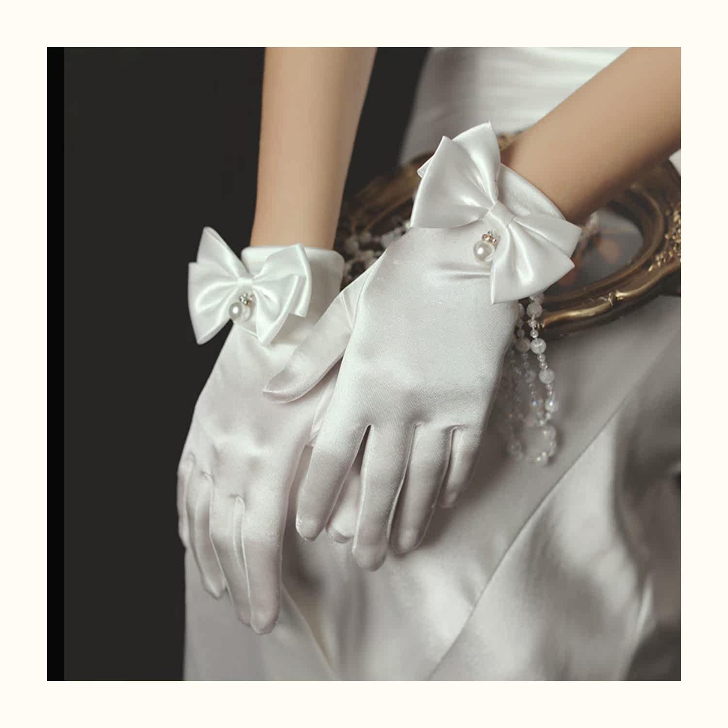 Белые демисезонные ретро перчатки для невесты с бантиком из жемчуга
