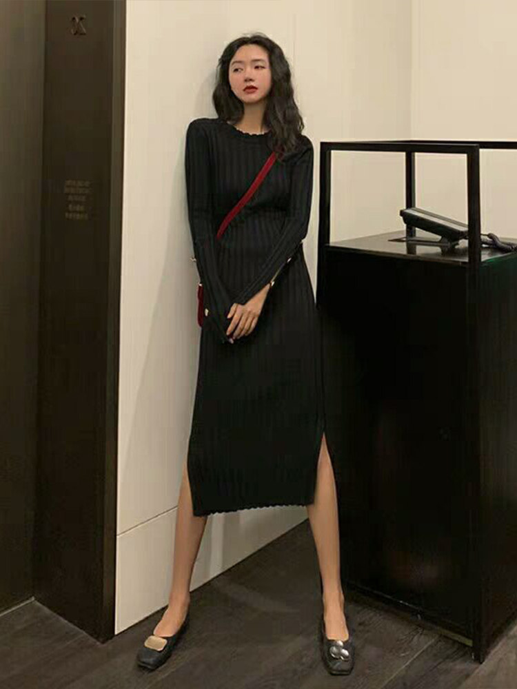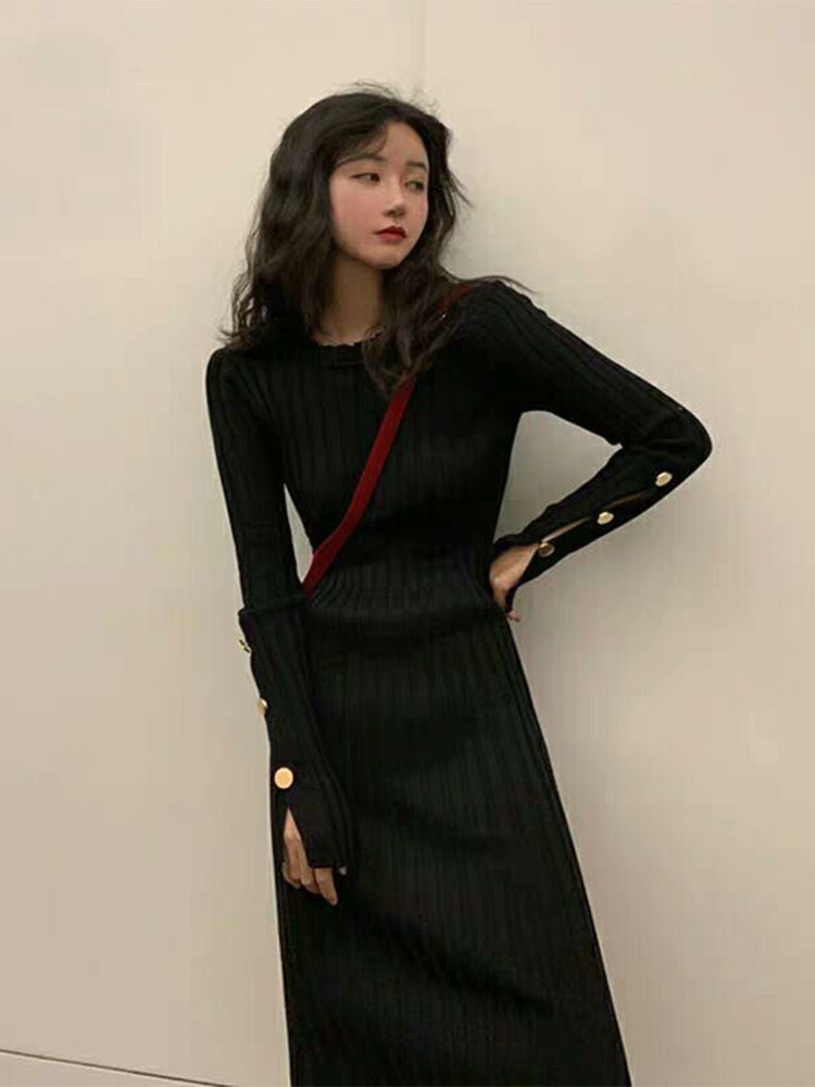 Весеннее ретро приталенное длинное трикотажное трикотажное платье с круглым воротником, 2024 года, французский стиль, средней длины