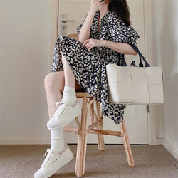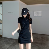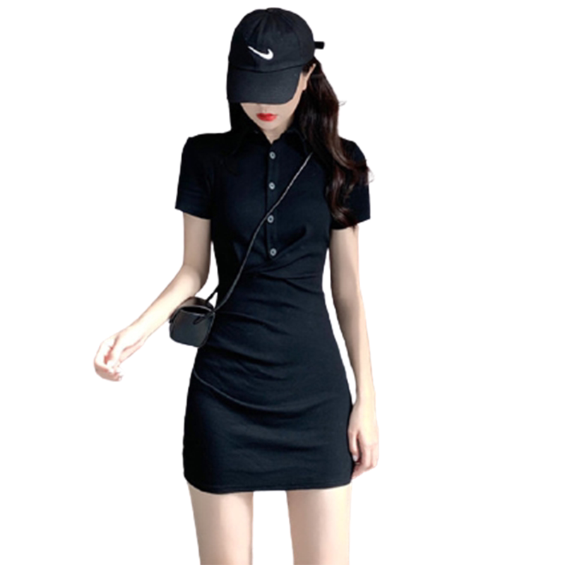 Летнее черное модное приталенное платье, городской стиль, воротник поло, короткий рукав, по фигуре, подходит для подростков