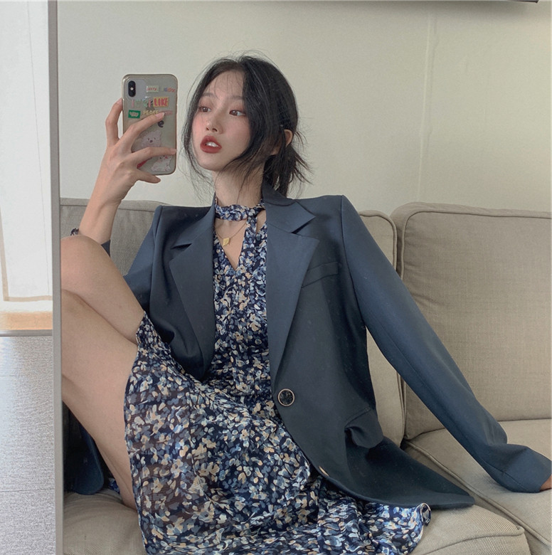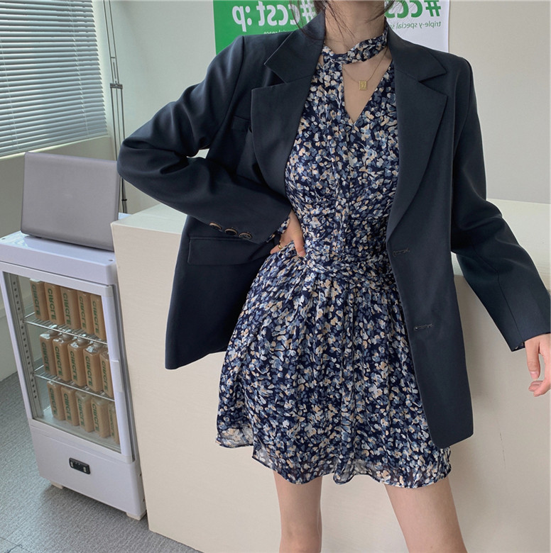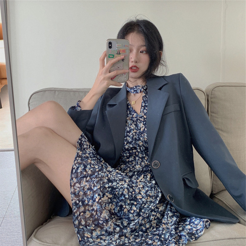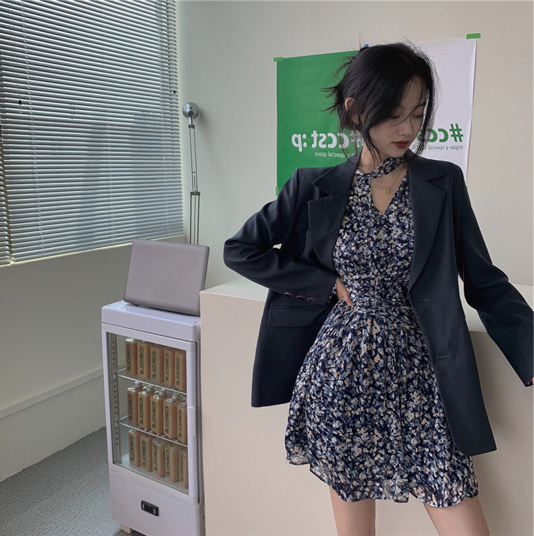 Осенний пиджак классического кроя, платье, комплект, городской стиль, подходит для подростков, в корейском стиле, в цветочек