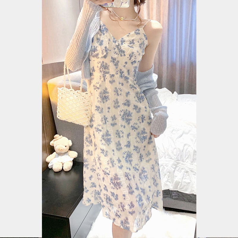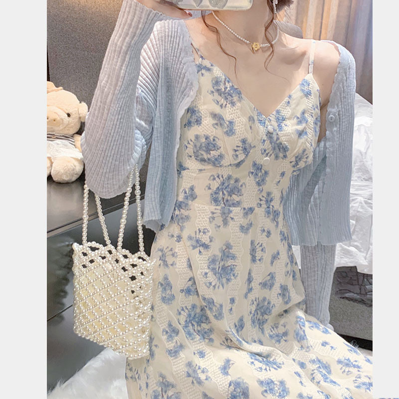 Весенний синий кардиган, платье, комплект, коллекция 2022, французский стиль, цветочный принт