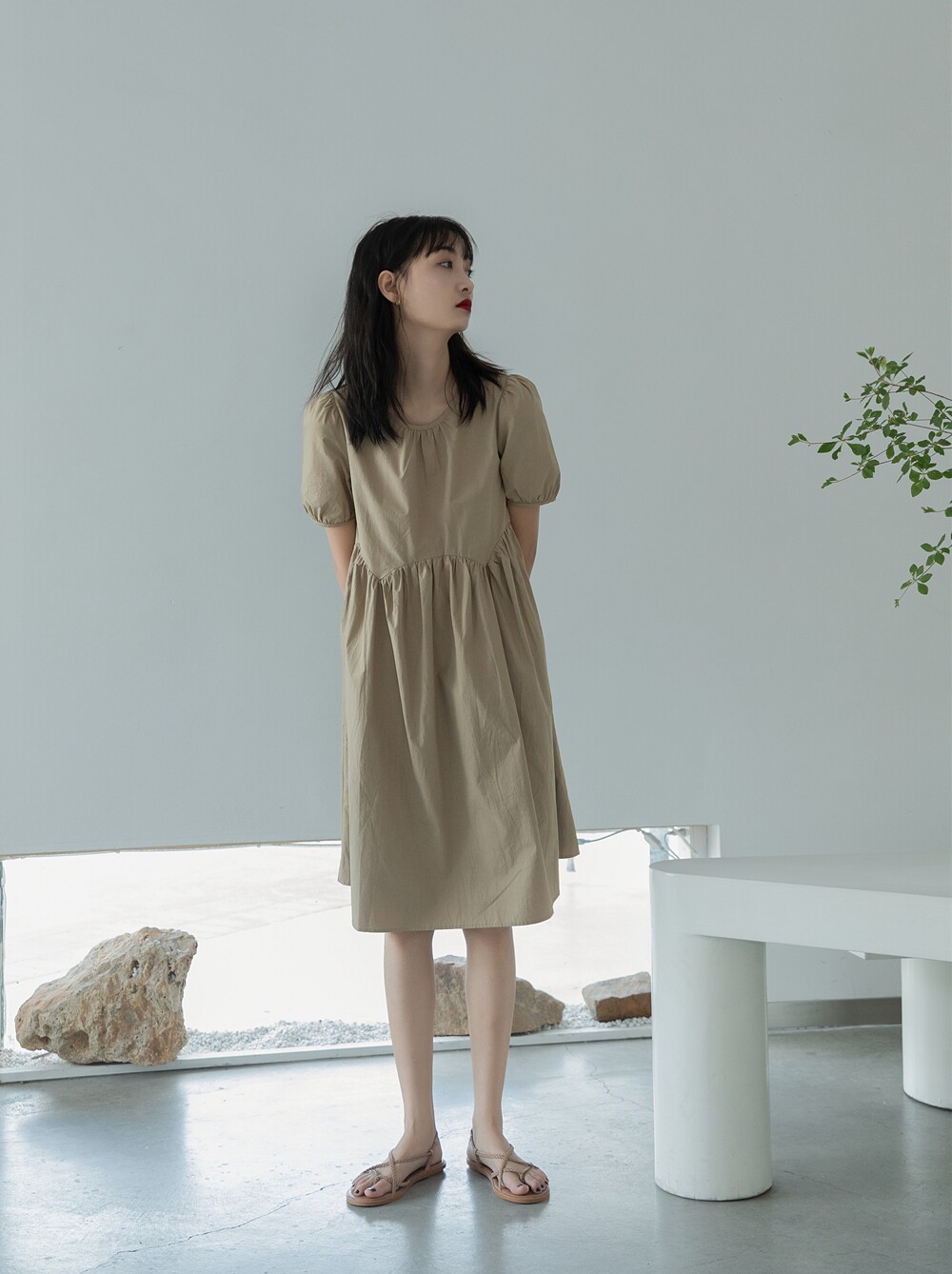 2023 Летние новые модели, тонкая круглая шейная дизайн ощущение высокой талии, маленькая, наклонная, тату -пузырьковая рукава над коленной юбкой