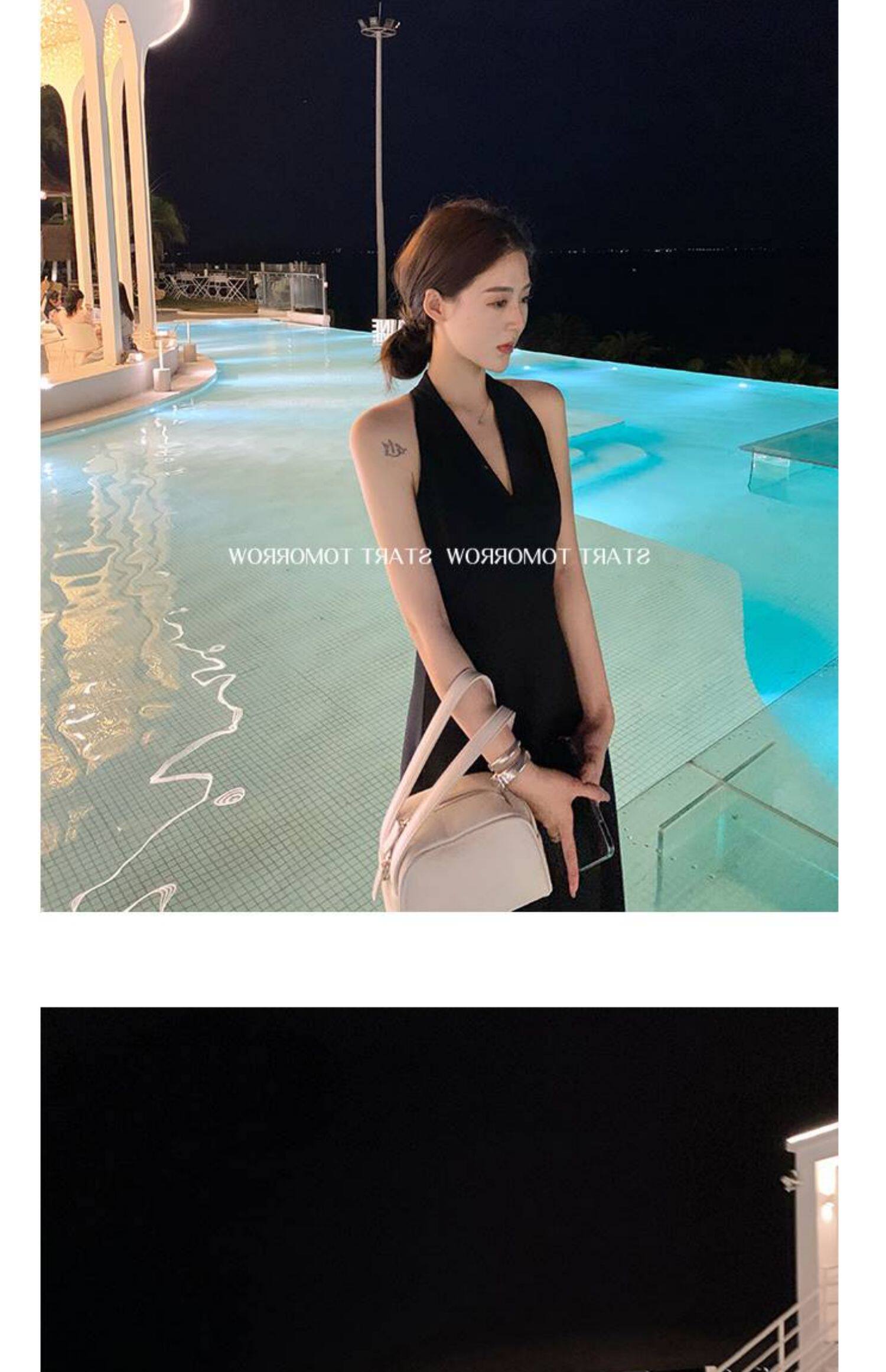 Черное летнее платье, длинная юбка, французский стиль, V-образный вырез, коллекция 2023