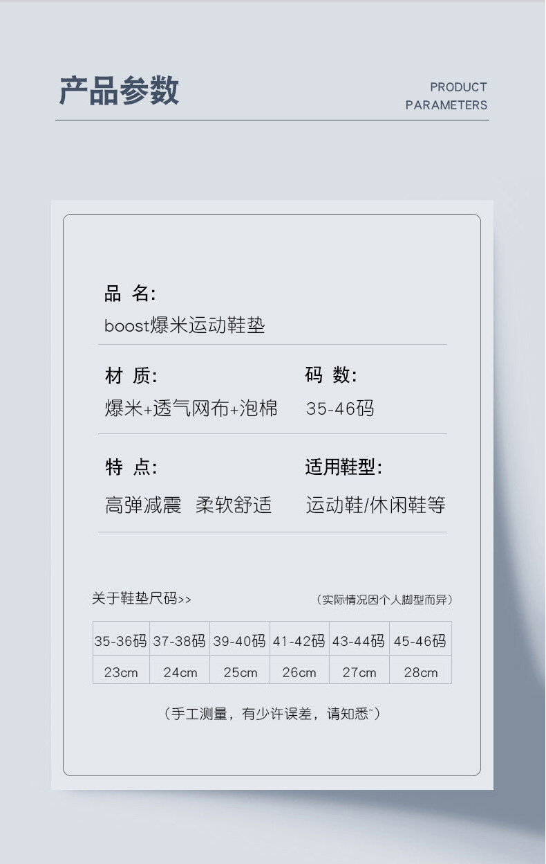 | Цвет: | [=====以下是柔软踩屎感款=====], [【踩屎感】白底黑面], [【踩屎感】白底灰面], [【踩屎感】白底橙面], [【踩屎感】橙底橙面], [【两双装】白底黑面], [【两双装】白底灰面], [【两双装】白底橙面], [【两双装】橙底橙面], [=====以下是螺母双减震款=====], [【1双装】螺母灰色], [【1双装】螺母蓝色], [【2双装】螺母灰色], [【2双装】螺母蓝色], [=====以下是牛皮乳胶款=====], [【1双】头层小牛皮乳胶-白色], [【1双】头层小牛皮乳胶-黑色], [【2双】头层小牛皮乳胶-白色], [【2双】头层小牛皮乳胶-黑色] |